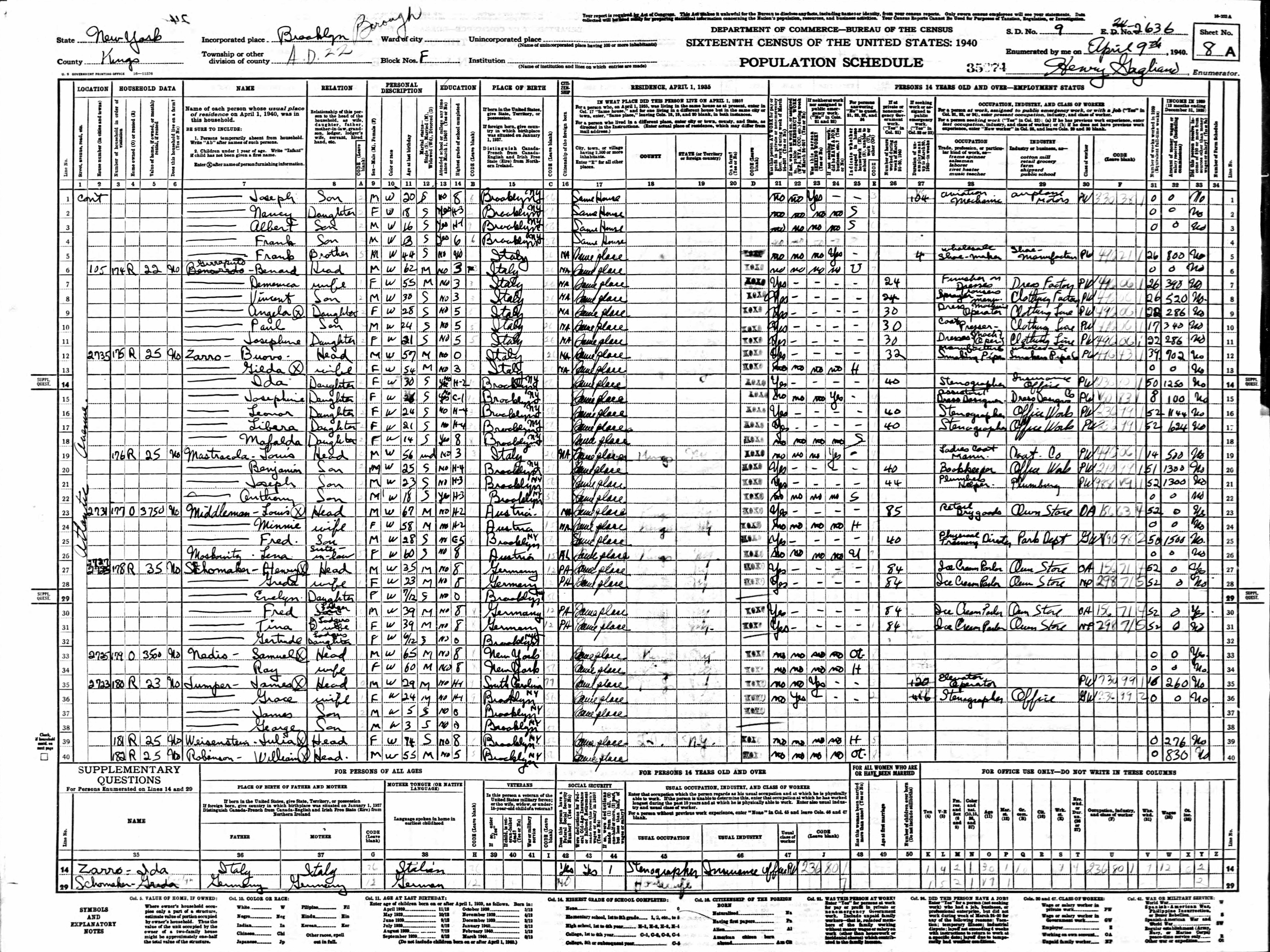 Zarro Family 1940 Federal Census New York, Lines 12-18
