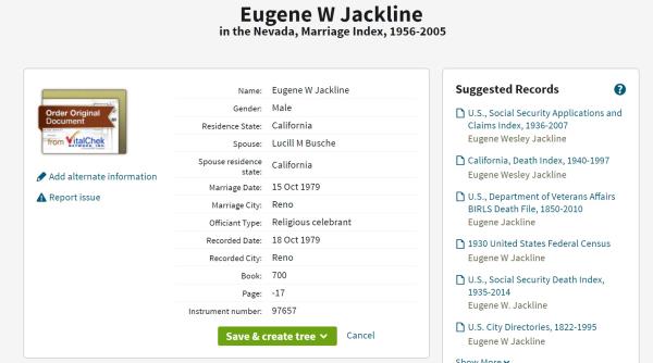 Eugene Wesley Jackline were married on October 15, 1979 in Reno, Washoe, Nevada, USA. She died.