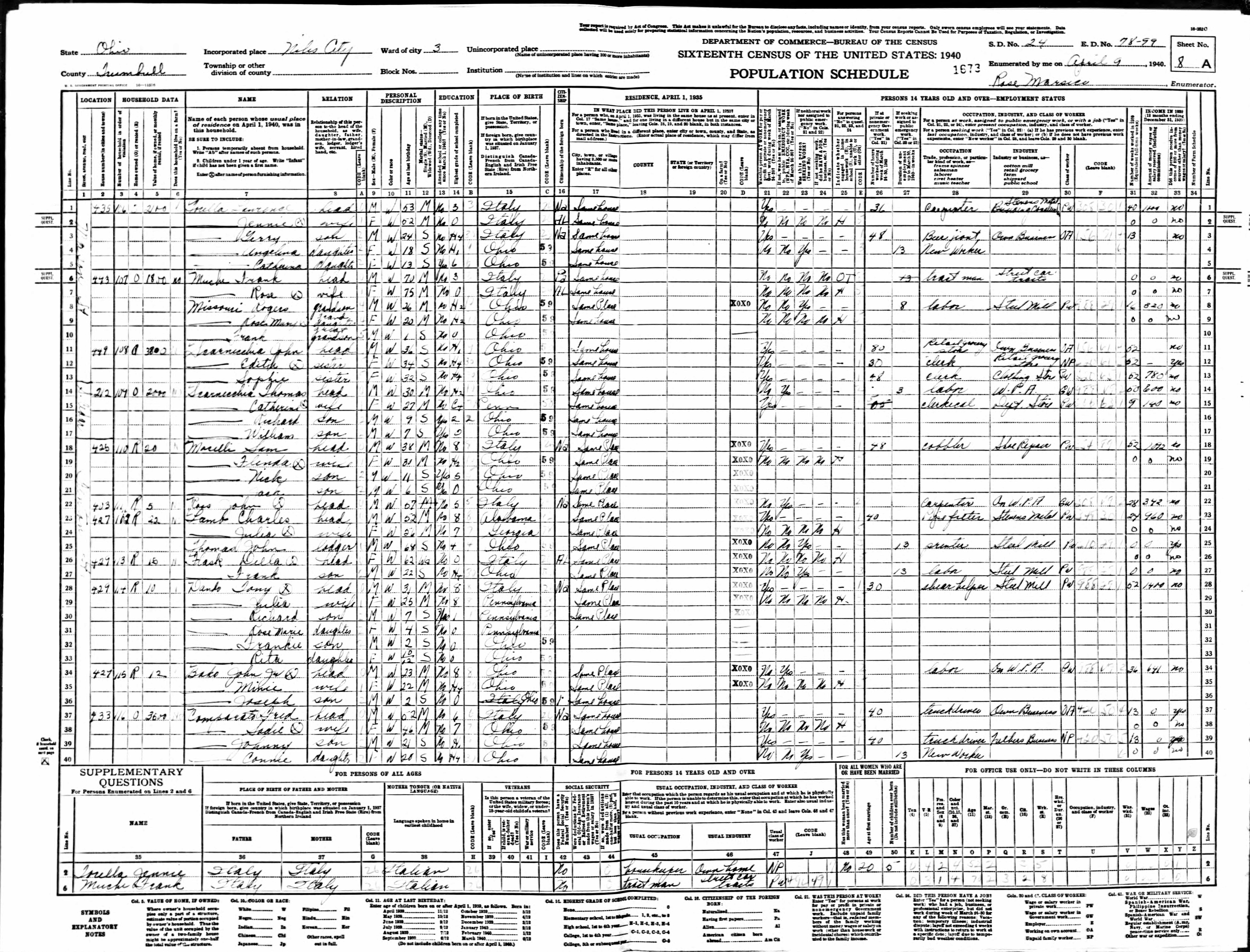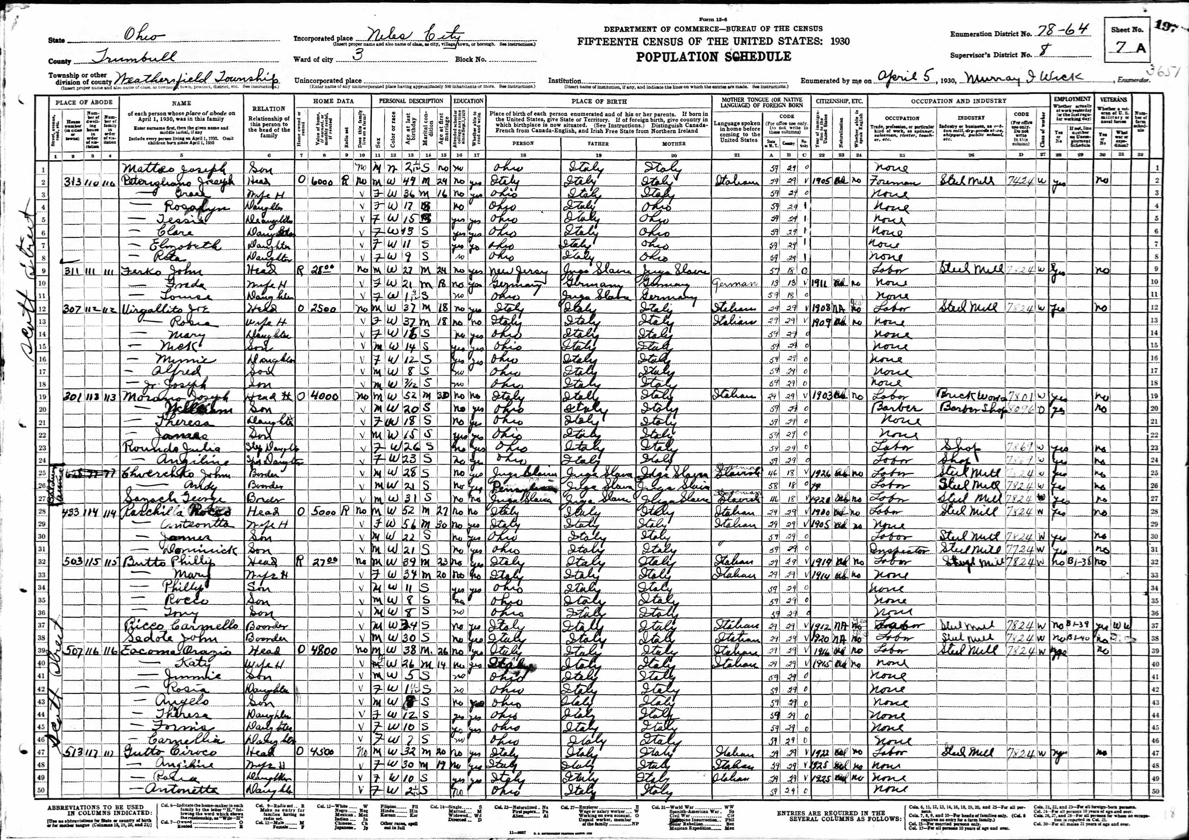 Virgallito Family 1930 Federal Census, Ohio, Lines 12-18