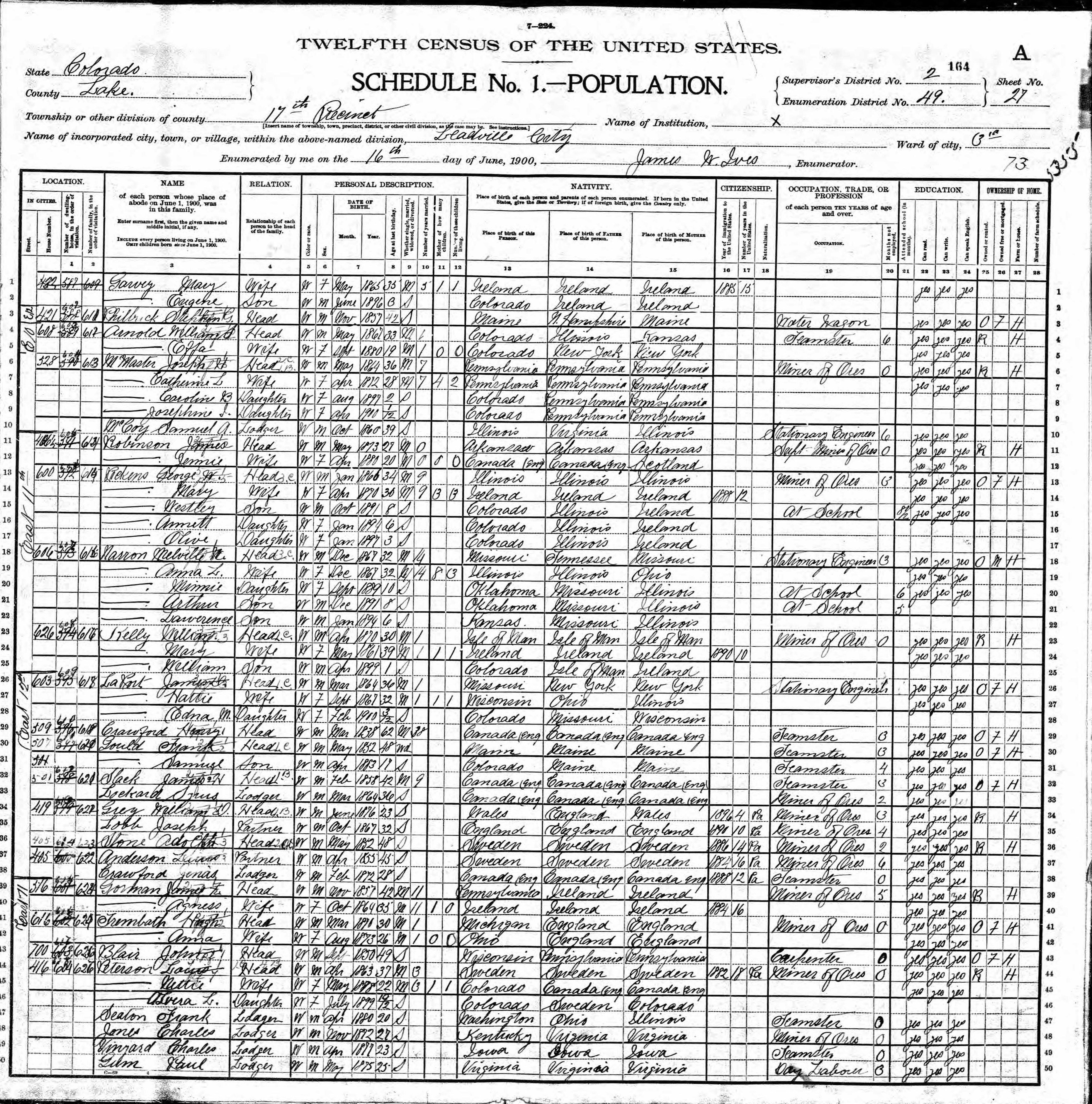 Narron Family 1900 Federal Census Colorado, Lines 18-21