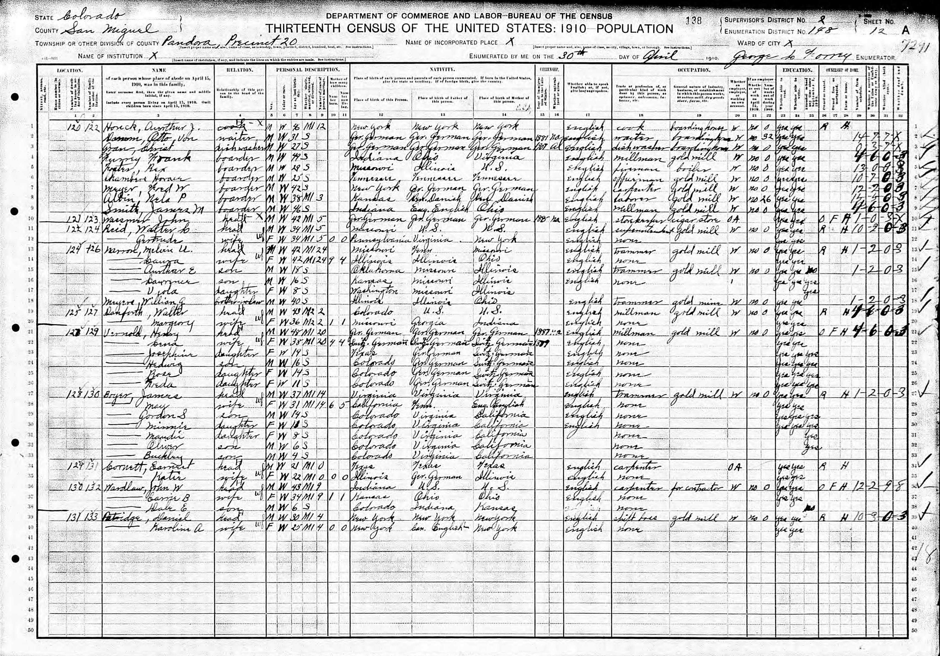 Narron Family 1910 Federal Census Colorado, Lines 13-18