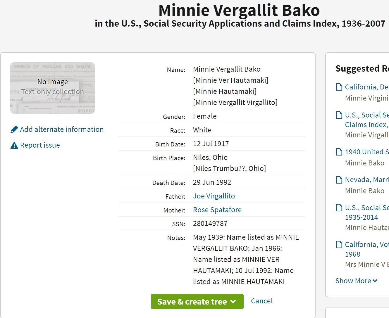 Minnie Virgallito was born on July 12, 1917 in Niles, Trumbull, Ohio, USA. She and