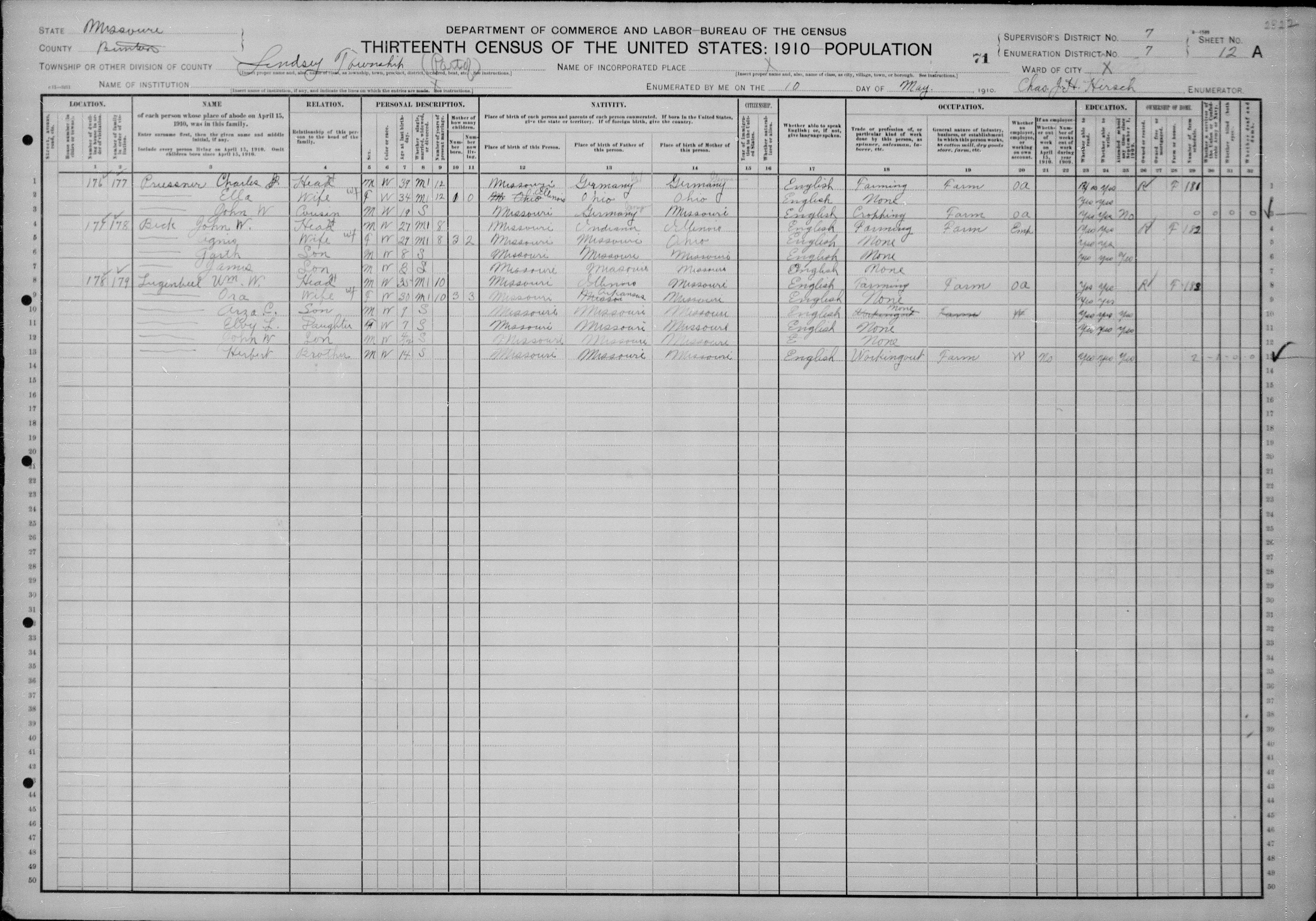 Lugenbeel Family 1910 Federal Census Missouri, Lines 8-13