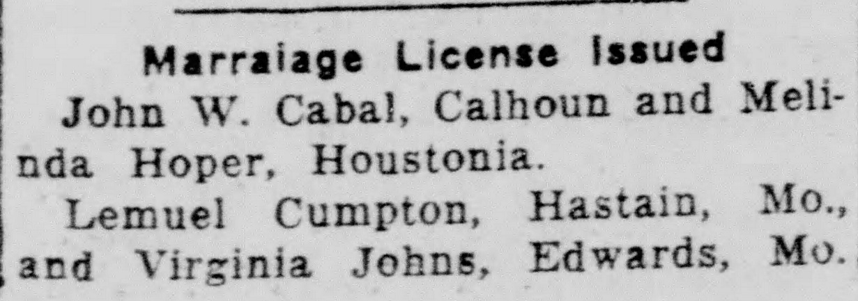 Opal Lee Cumpton were married on September 12, 1920 in Benton, Scott, Missouri, USA. He died in June 1982, at age 81, in Hastain, Benton, Missouri, USA. He was buried in Hastain Cemetery, Hastain, Missouri.