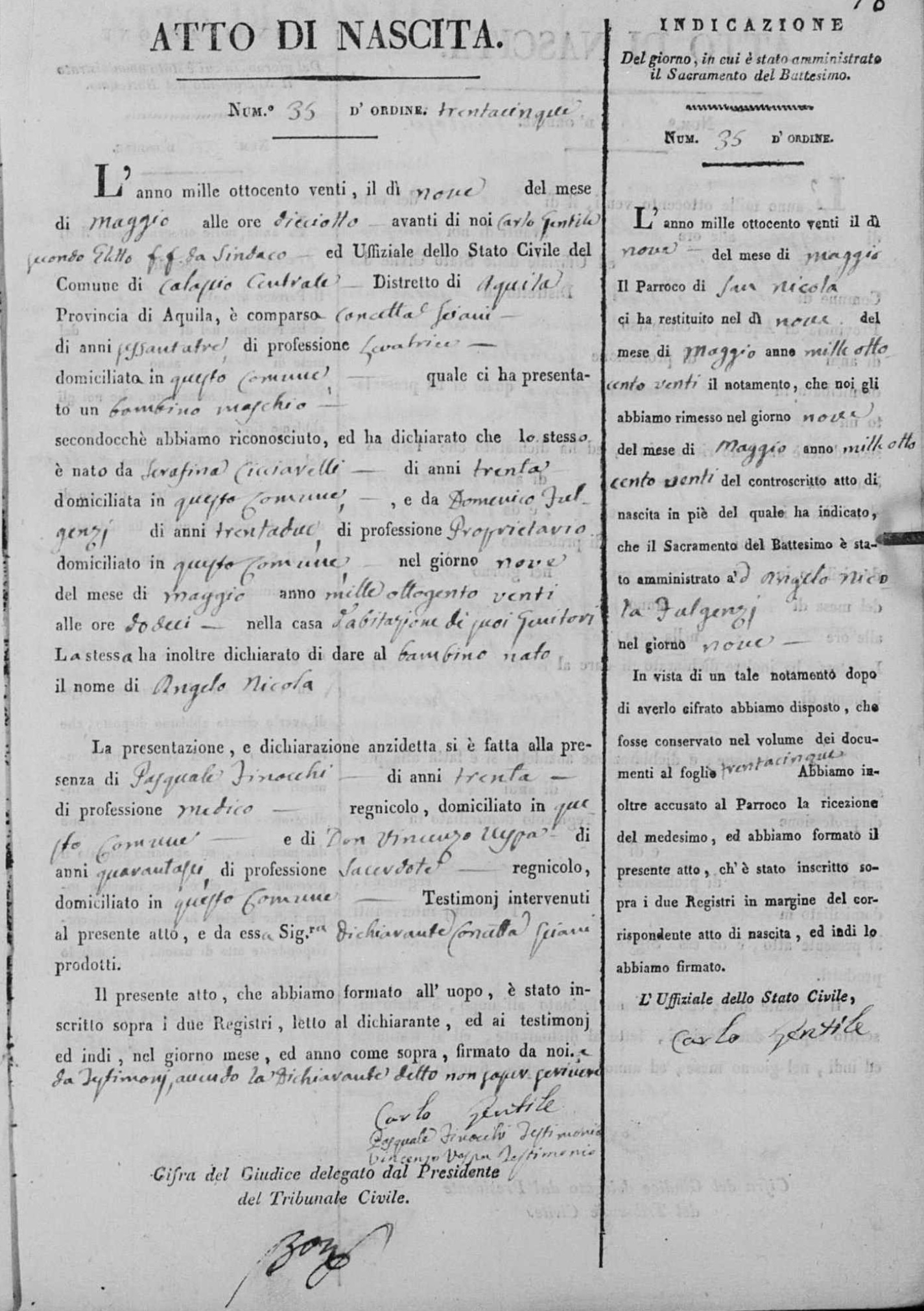 Angelo Nicola Fulgenzi was born on May 9, 1820 in Calascio, L'Aquila, Abruzzo, Italy. He and