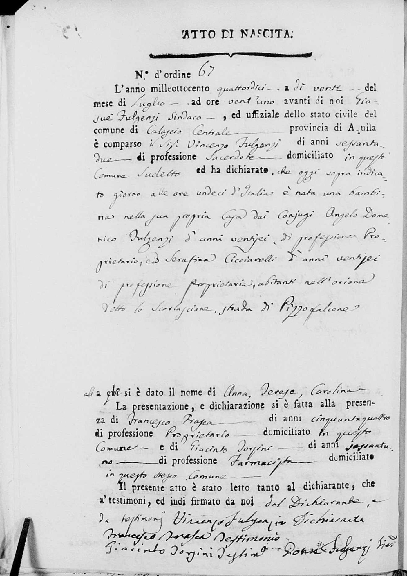 Giuseppe Fulgenzi was born in 1778 in Calascio, L'Aquila, Abruzzo, Italy. He and