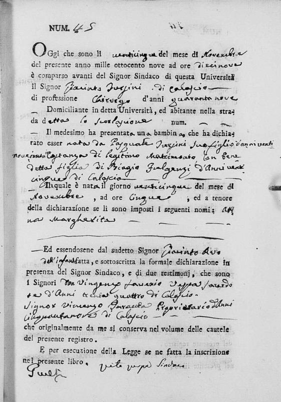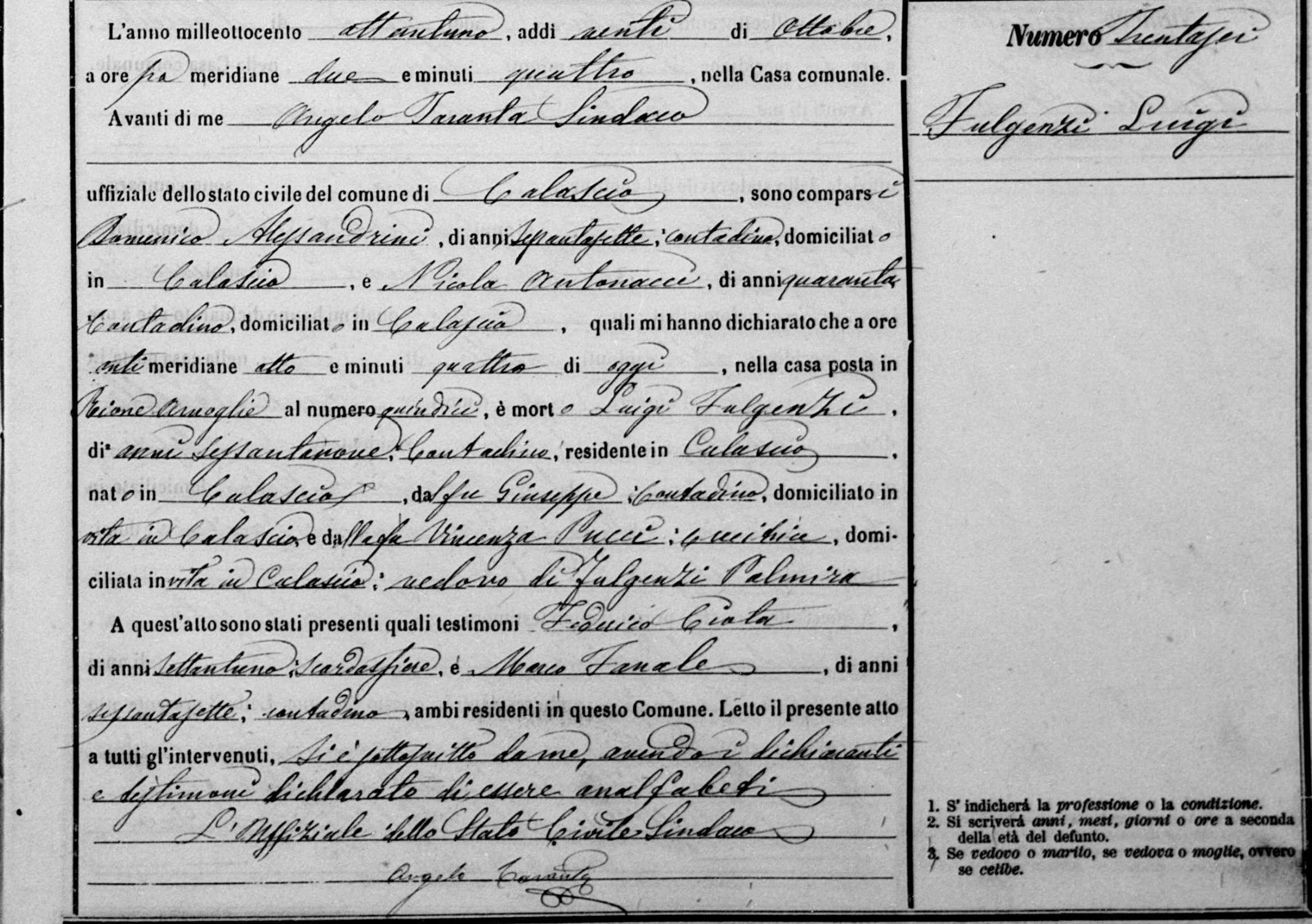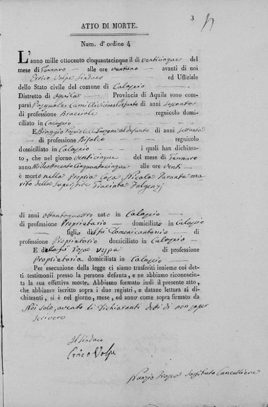 Giacinta Fulgenzi were married. He died on January 25, 1855, at age ~85, in Calascio, L'Aquila, Abruzzo, Italy.