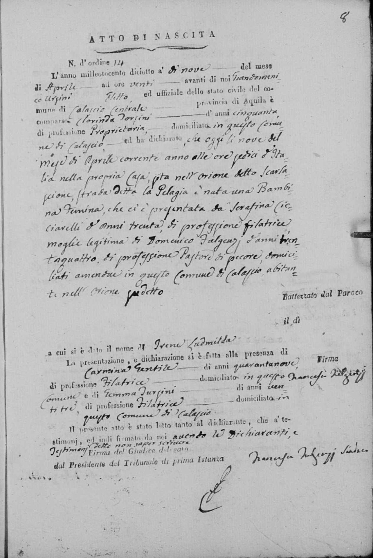 Irene Ludmilda Fulgenzi was born on April 9, 1818 in Calascio, L'Aquila, Abruzzo, Italy. She and