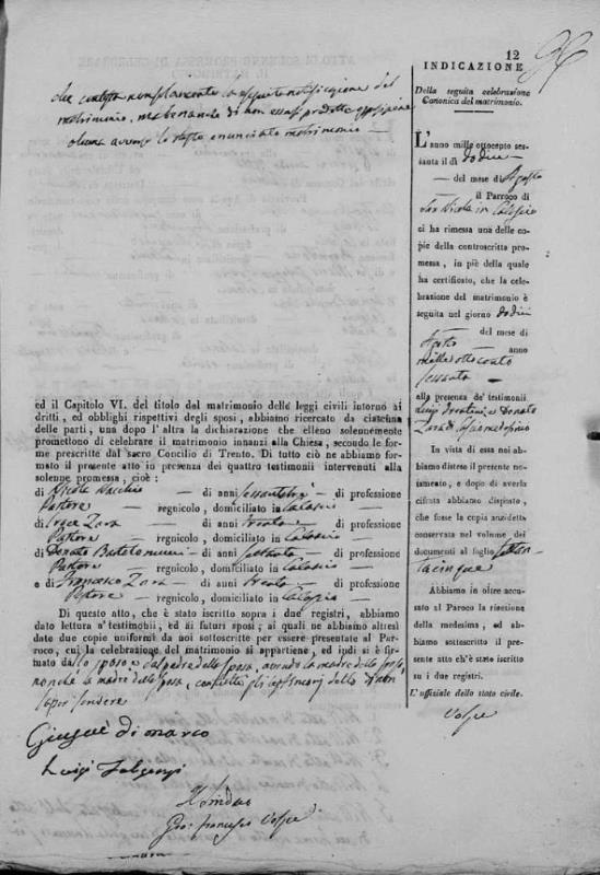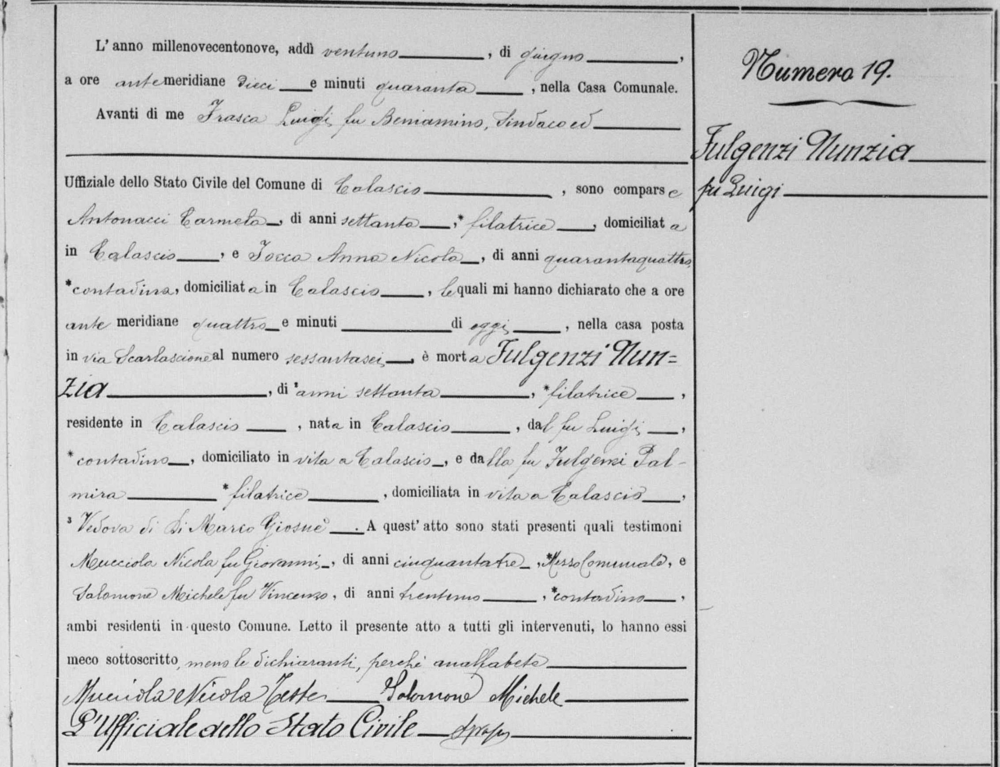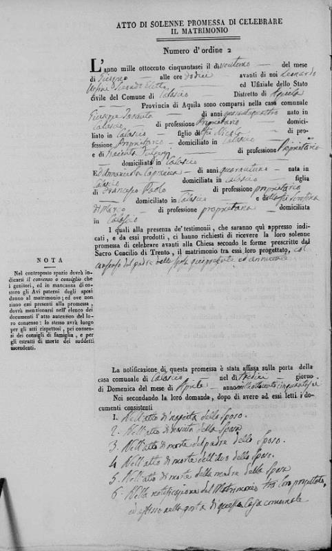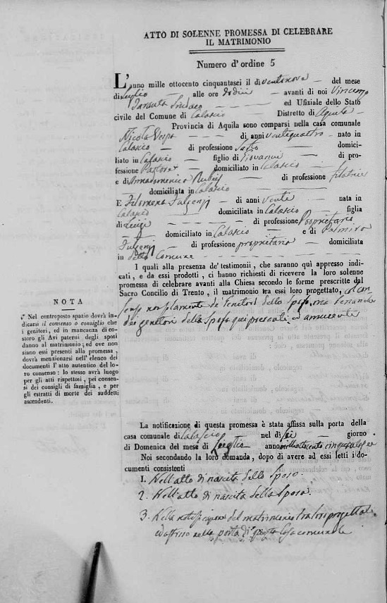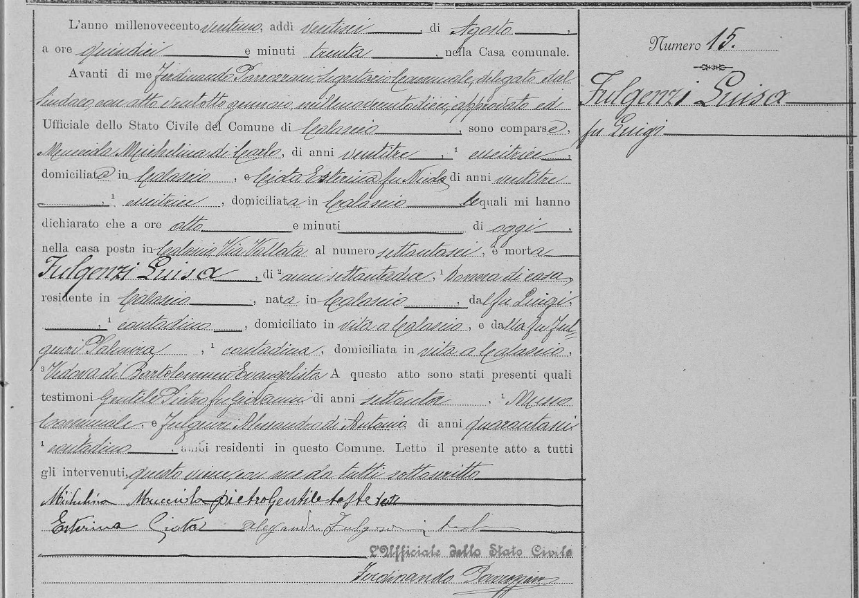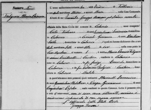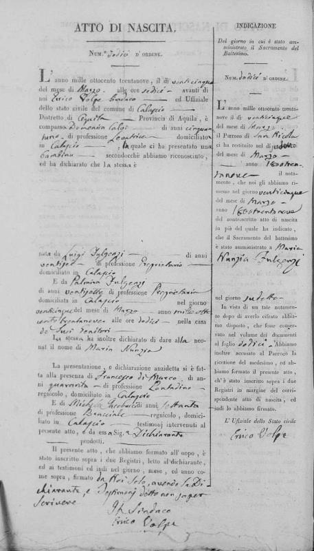 Maria Nunzia Fulgenzi were married on August 12, 1860 in Calascio, L'Aquila, Abruzzo, Italy. He died.