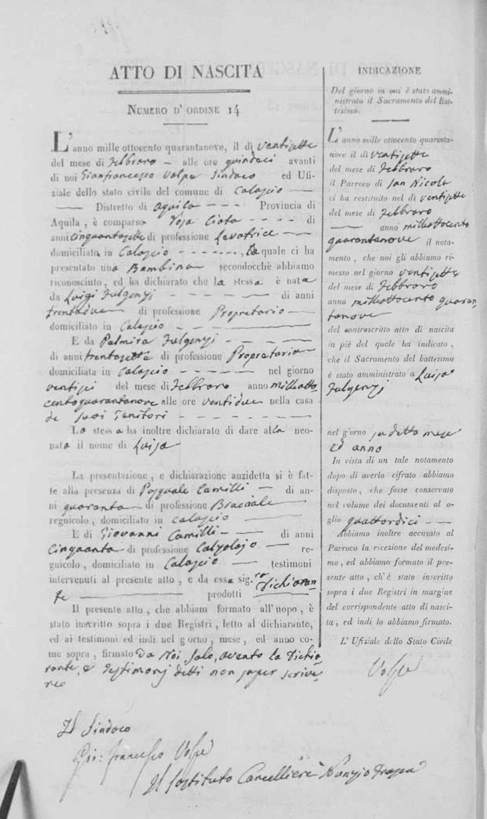 Luisa Fulgenzi was born on February 26, 1849 in Calascio, L'Aquila, Abruzzo, Italy. She and
