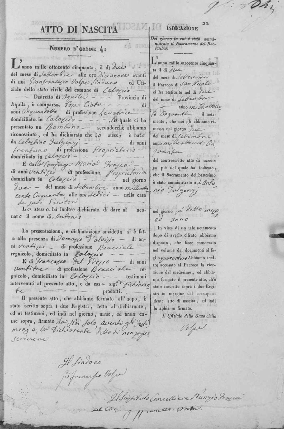 Antonio Fulgenzi was born on September 2, 1850 in Calascio, L'Aquila, Abruzzo, Italy. He and