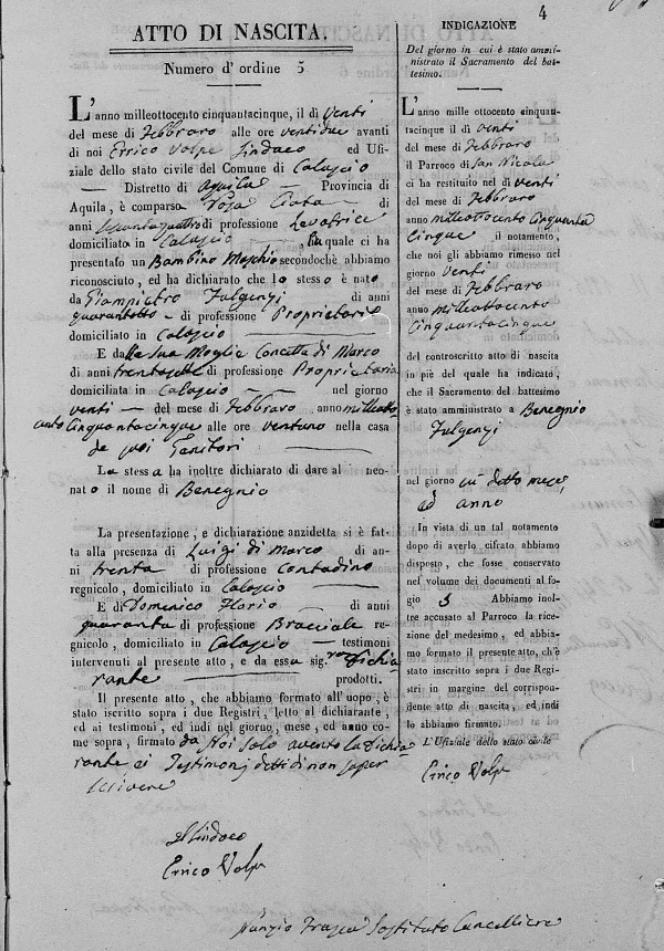 Bengnio Fulgenzi was born on February 20, 1855 in Calascio, L'Aquila, Abruzzo, Italy. He and