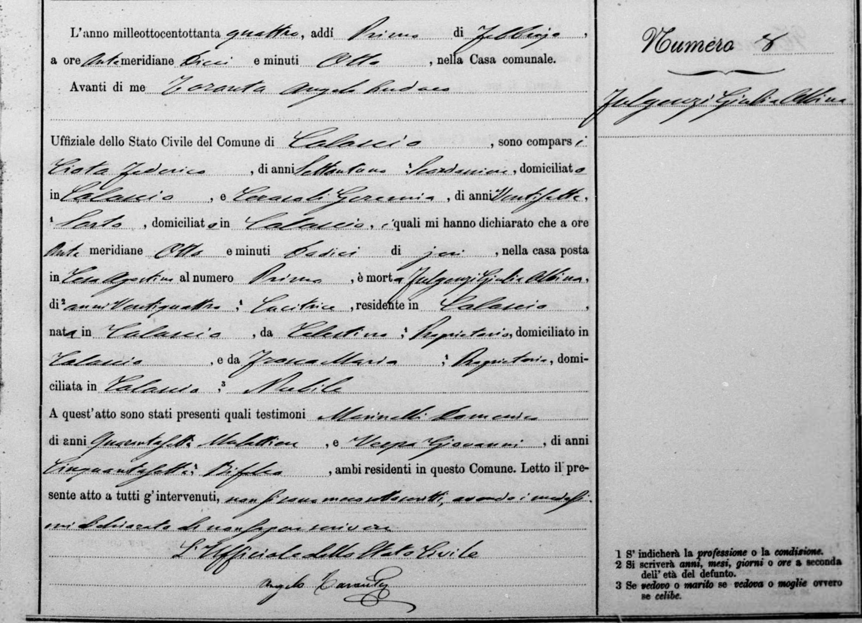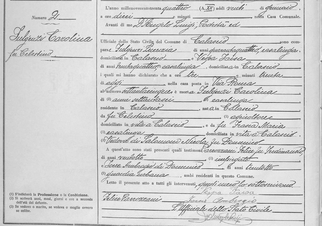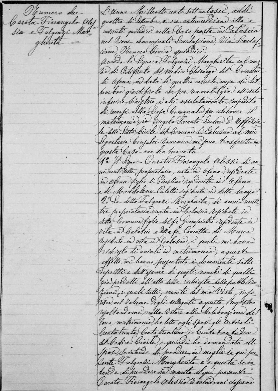 Fiorangelo Alessio Carota were married on September 4, 1876 in Calascio, L'Aquila, Abruzzo, Italy. She died.