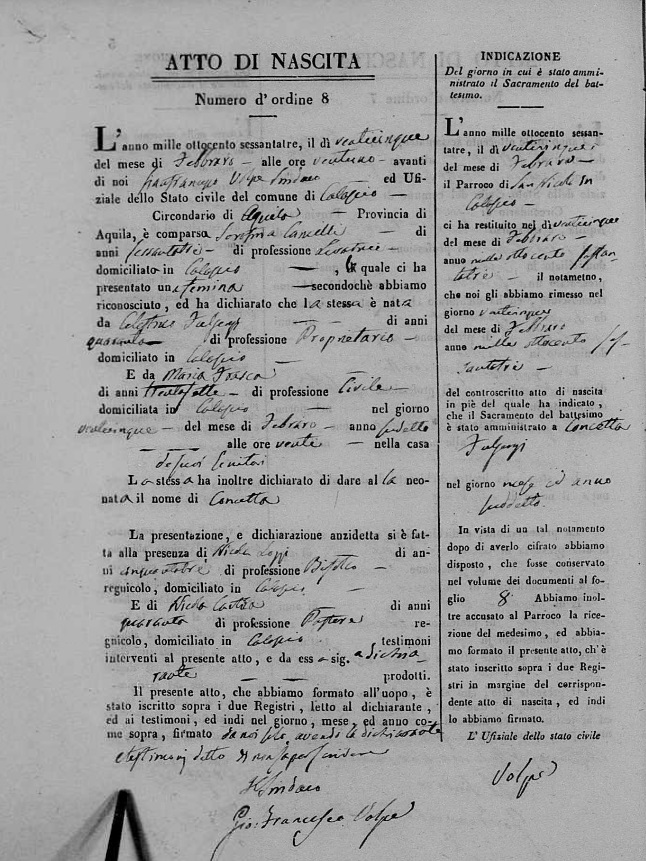 Concetta Fulgenzi was born on February 25, 1863 in Calascio, L'Aquila, Abruzzo, Italy. She and