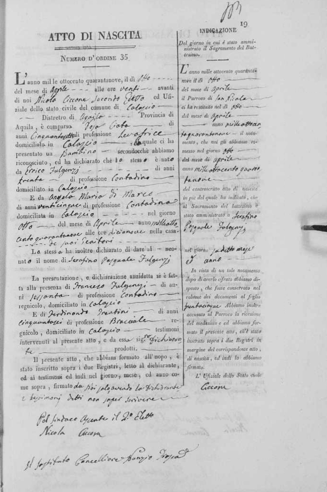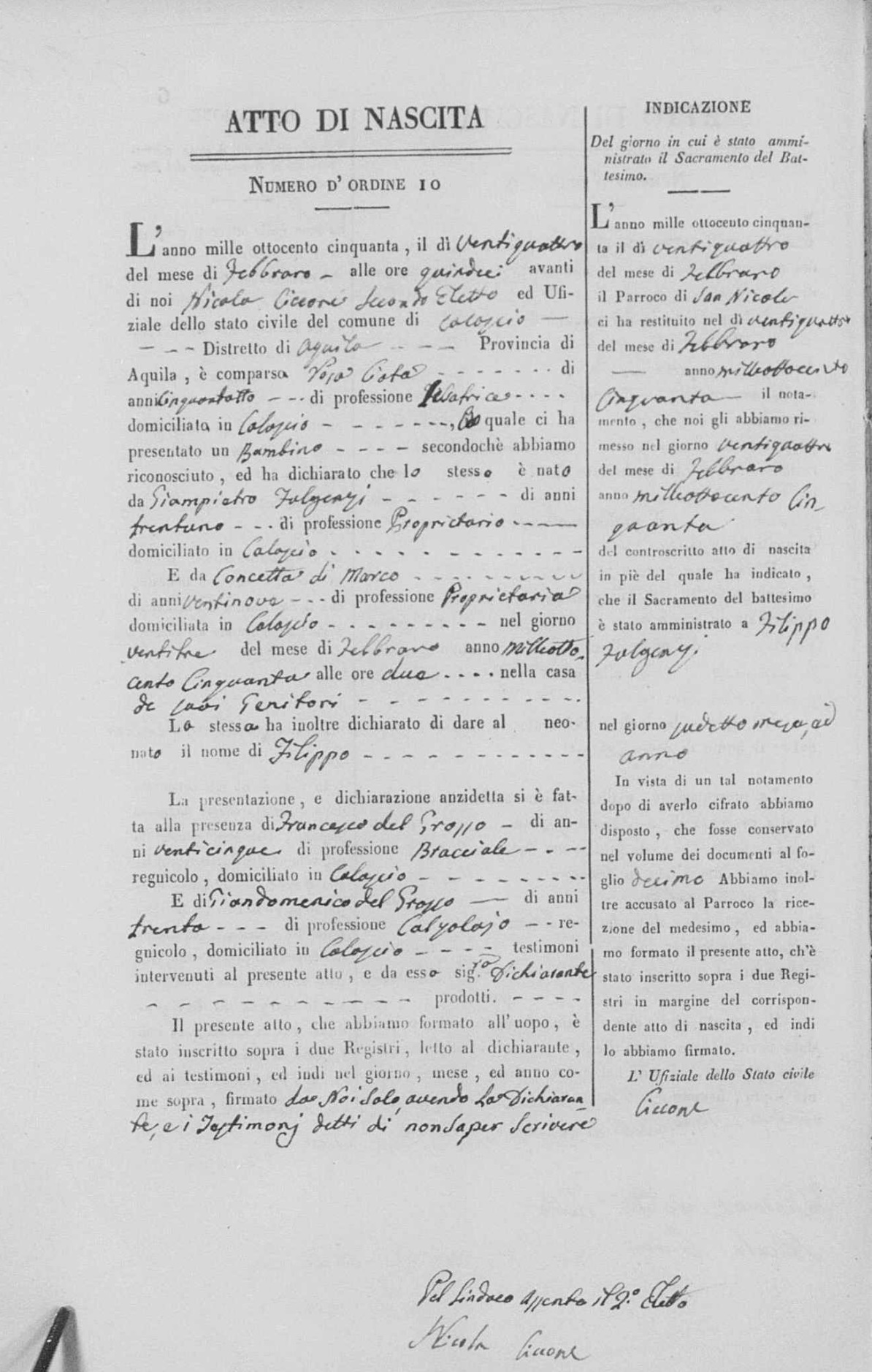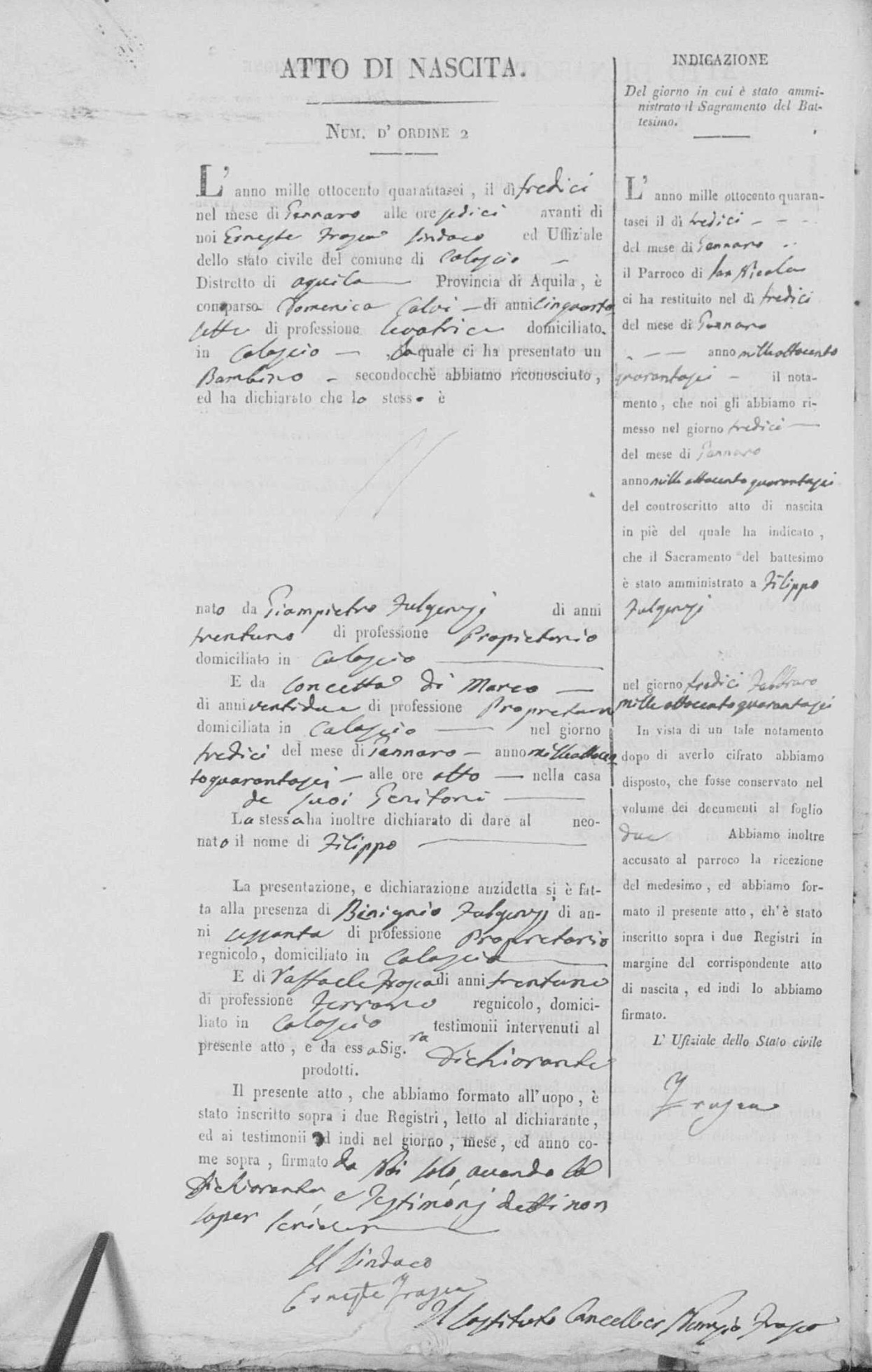 Filippo Fulgenzi was born on February 23, 1850 in Calascio, L'Aquila, Abruzzo, Italy. He died on February 25, 1850, at age 0, in Calascio, L'Aquila, Abruzzo, Italy.