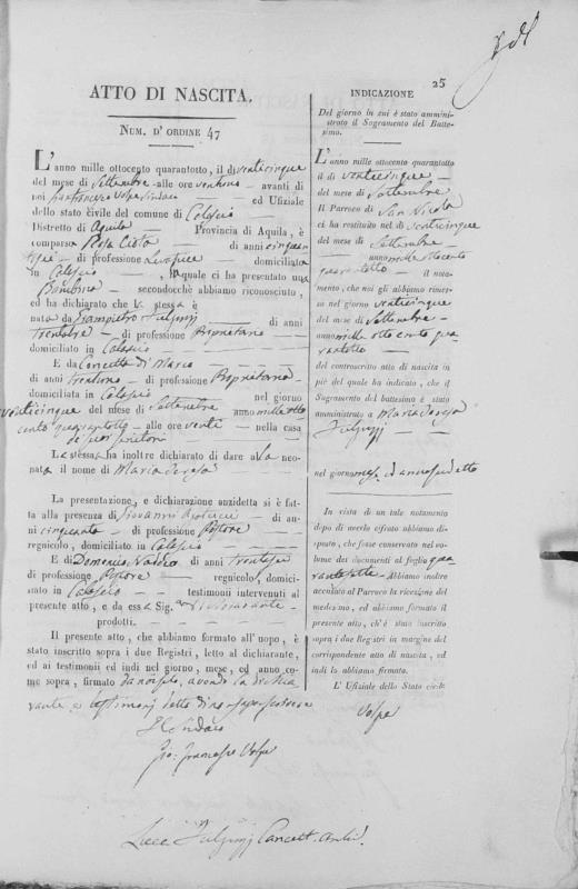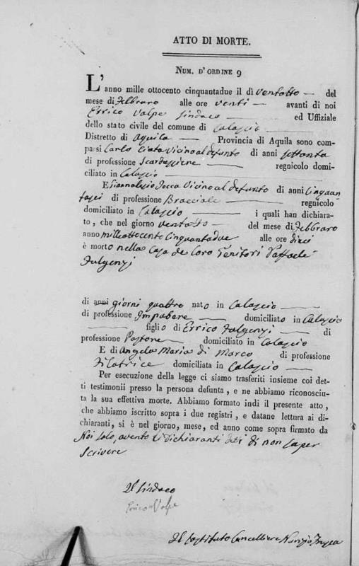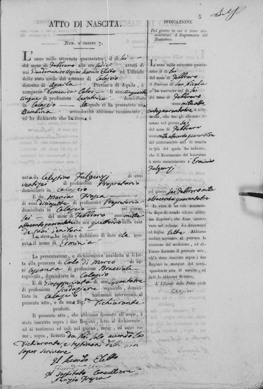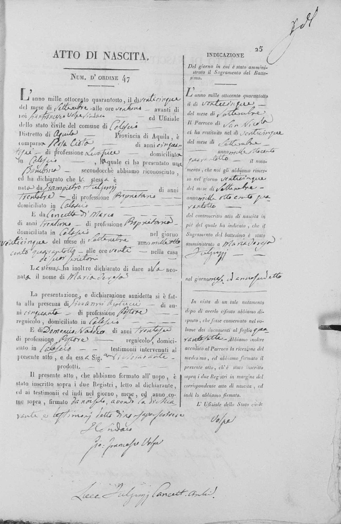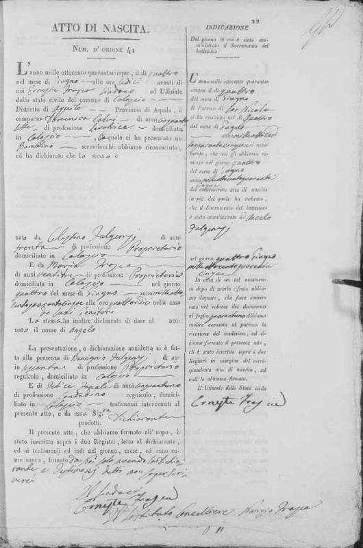 Filippo Fulgenzi was born on February 23, 1850 in Calascio, L'Aquila, Abruzzo, Italy. He died on February 25, 1850, at age 0, in Calascio, L'Aquila, Abruzzo, Italy.