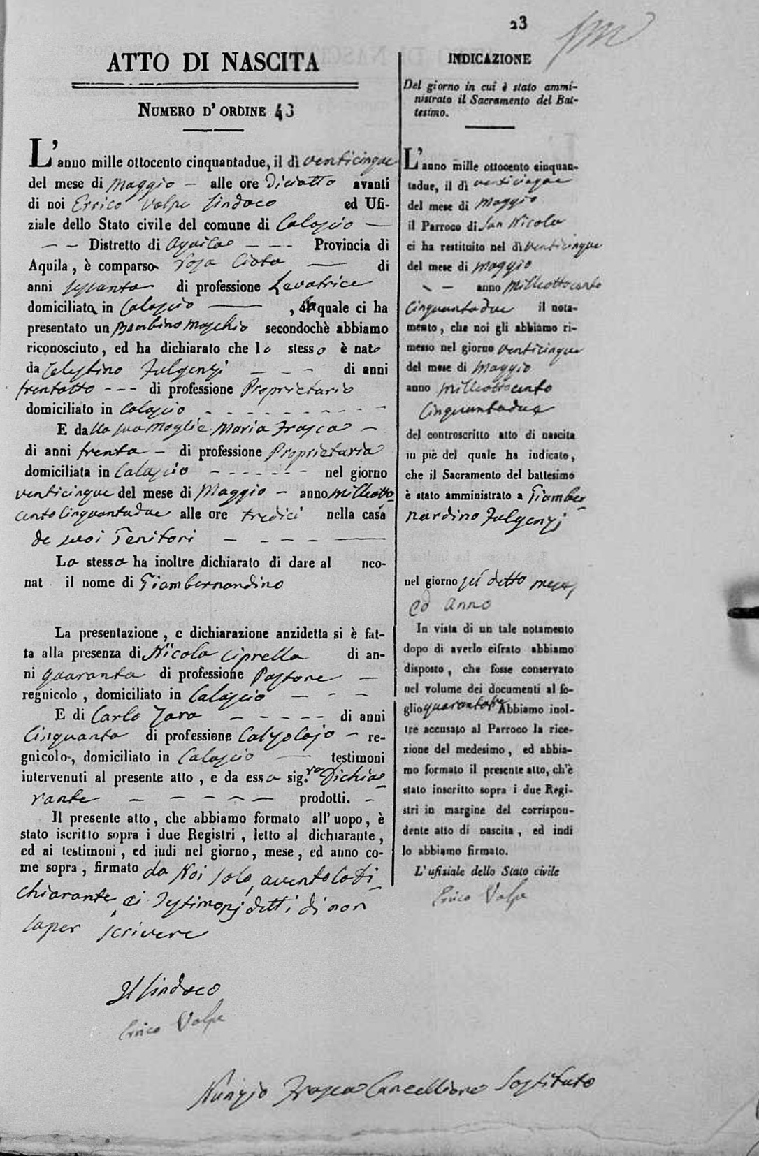 Giambernadino Fulgenzi was born on May 25, 1852 in Calascio, L'Aquila, Abruzzo, Italy. He and
