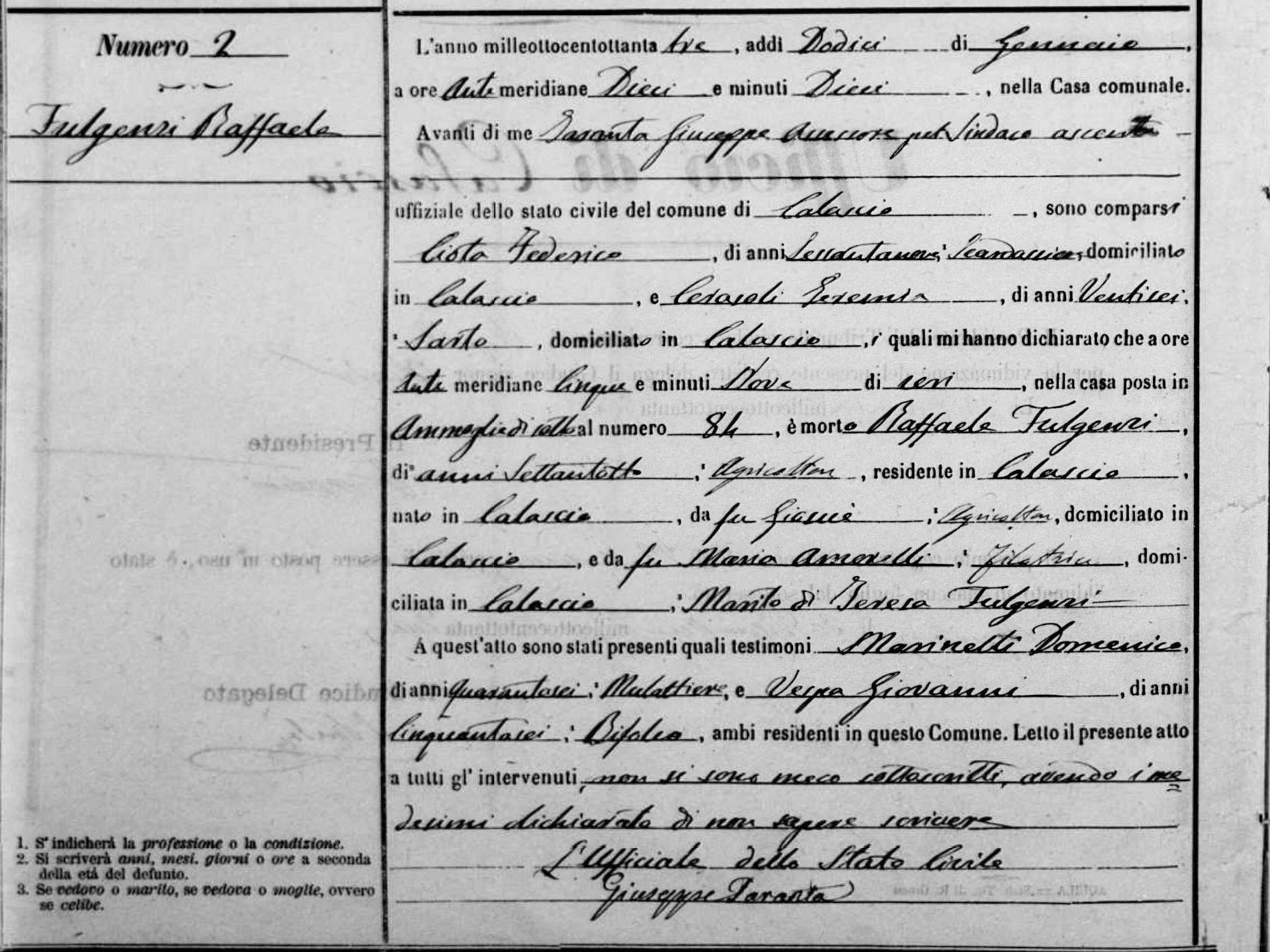 Raffaele Fulgenzi was born on February 24, 1852 in Calascio, L'Aquila, Abruzzo, Italy. He died on February 28, 1852, at age 0, in Calascio, L'Aquila, Abruzzo, Italy.