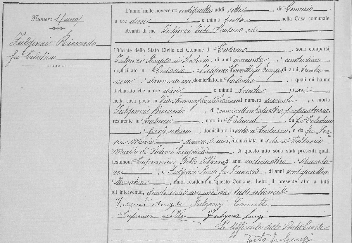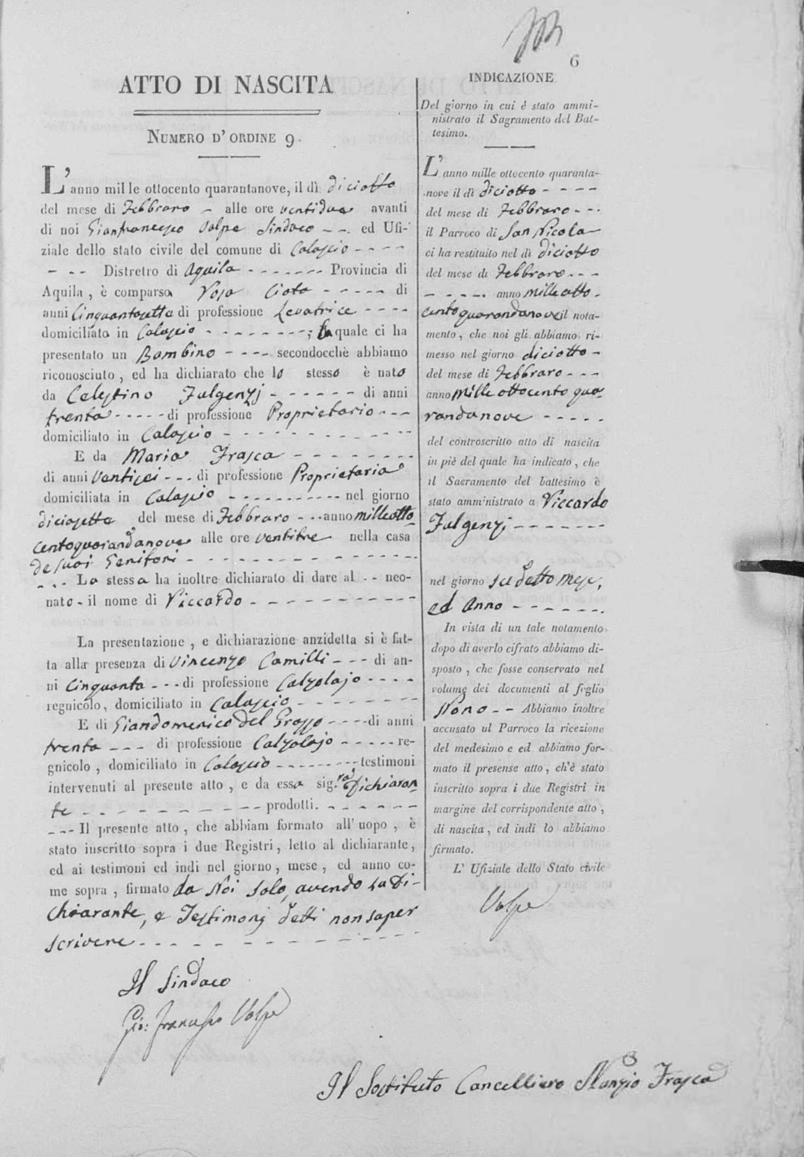 Riccardo Fulgenzi was born on February 17, 1849 in Calascio, L'Aquila, Abruzzo, Italy. He and