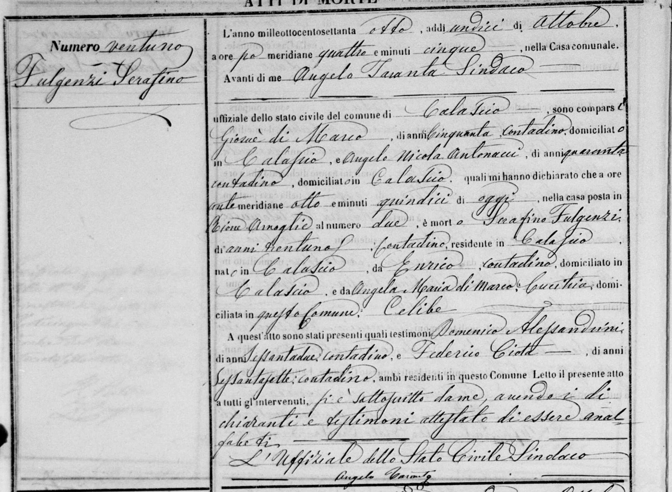 Serafino Pasquale Fulgenzi was born on April 8, 1849 in Calascio, L'Aquila, Abruzzo, Italy. He died on October 11, 1878, at age 29, in Calascio, L'Aquila, Abruzzo, Italy.