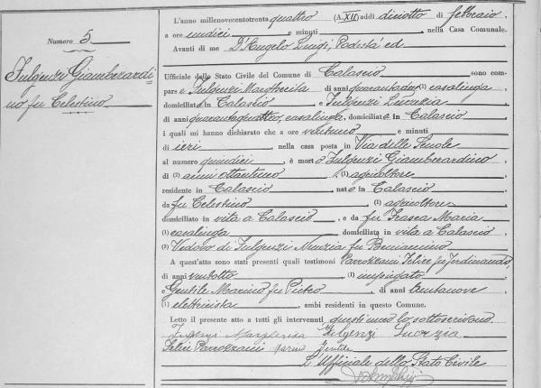 Nunzia Fulgenzi were married on June 29, 1899 in Calascio, L'Aquila, Abruzzo, Italy. He died on February 18, 1935, at age 82, in Calascio, L'Aquila, Abruzzo, Italy.