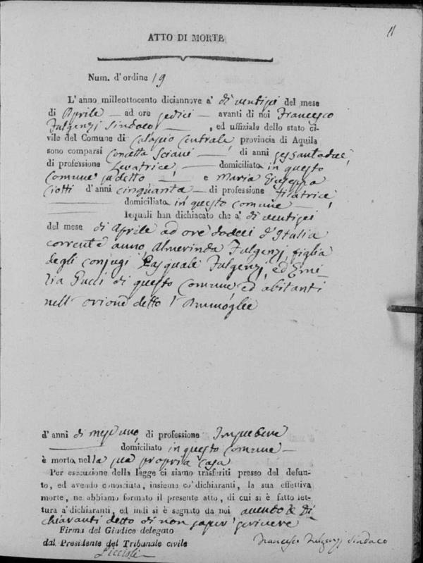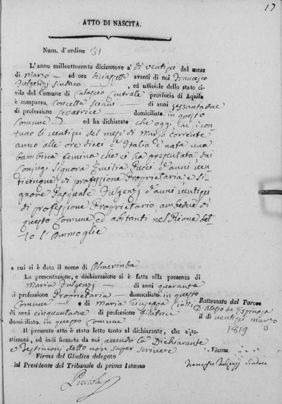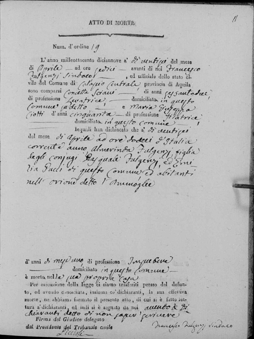 Almerinda Fulgenzi was born on March 26, 1819 in Calascio, L'Aquila, Abruzzo, Italy. She died on April 26, 1819, at age 0, in Calascio, L'Aquila, Abruzzo, Italy.