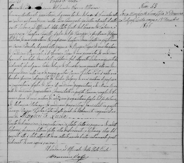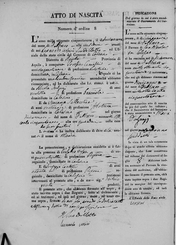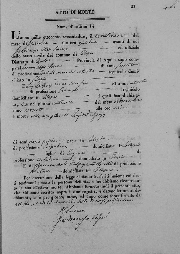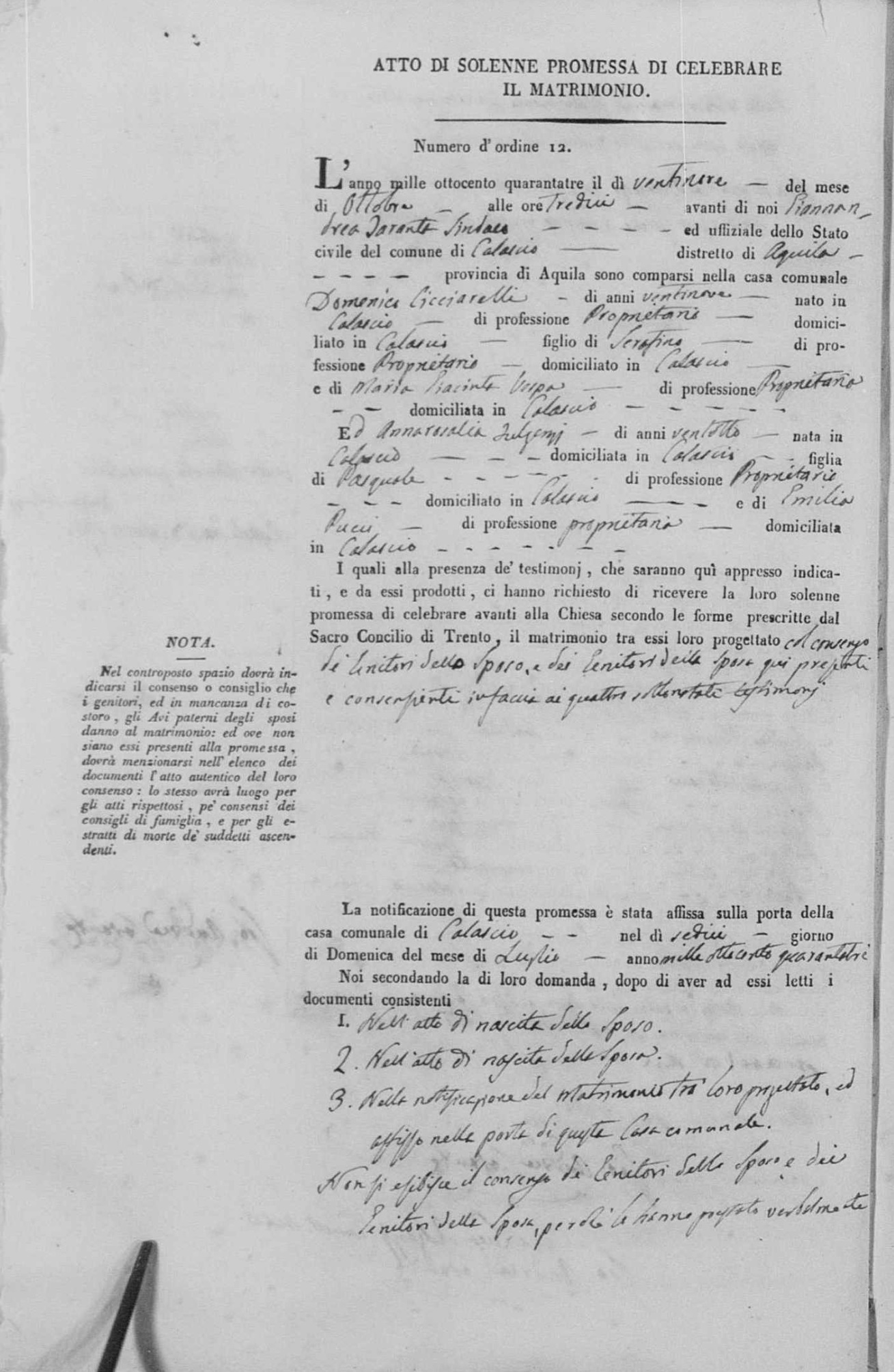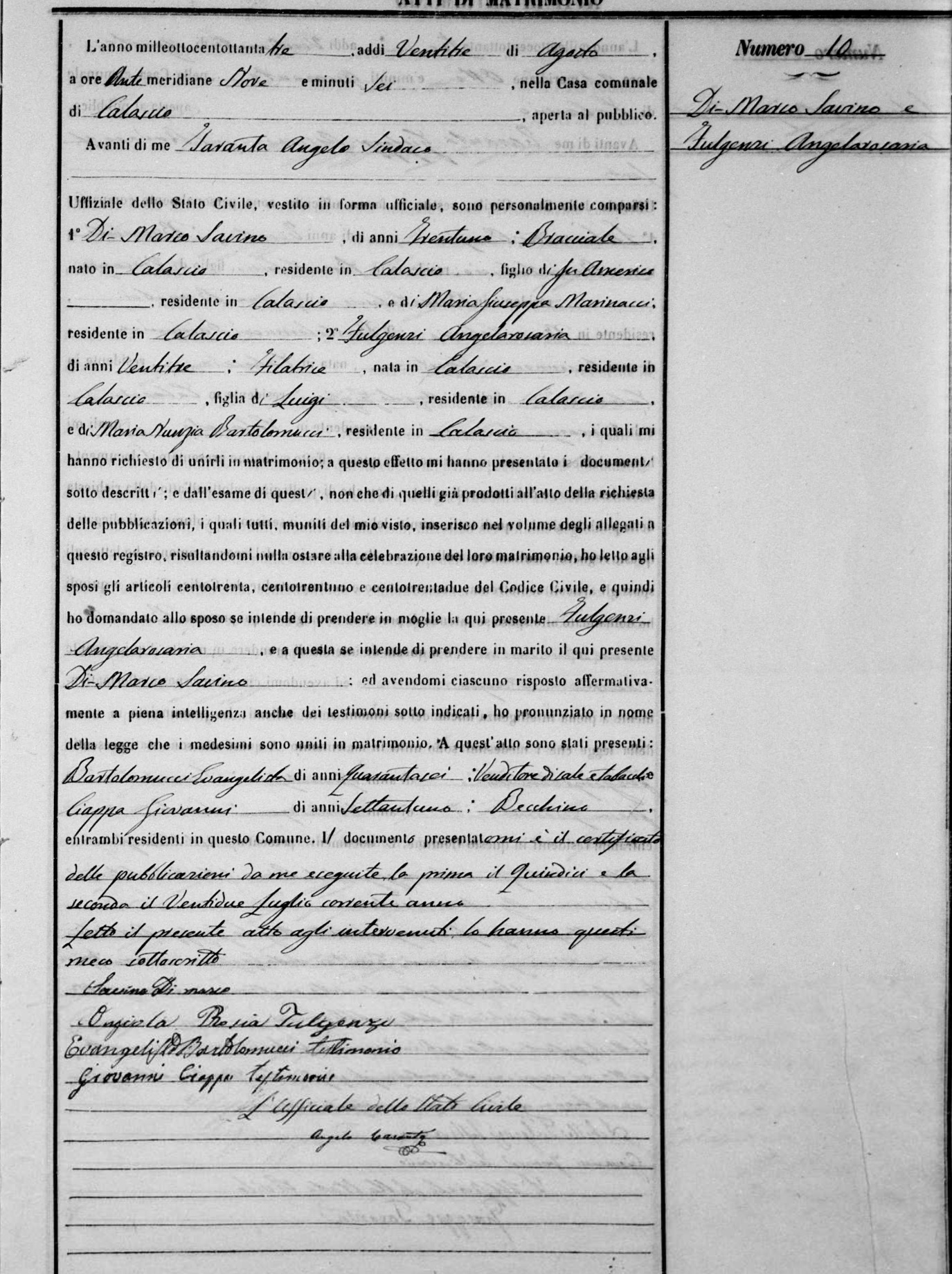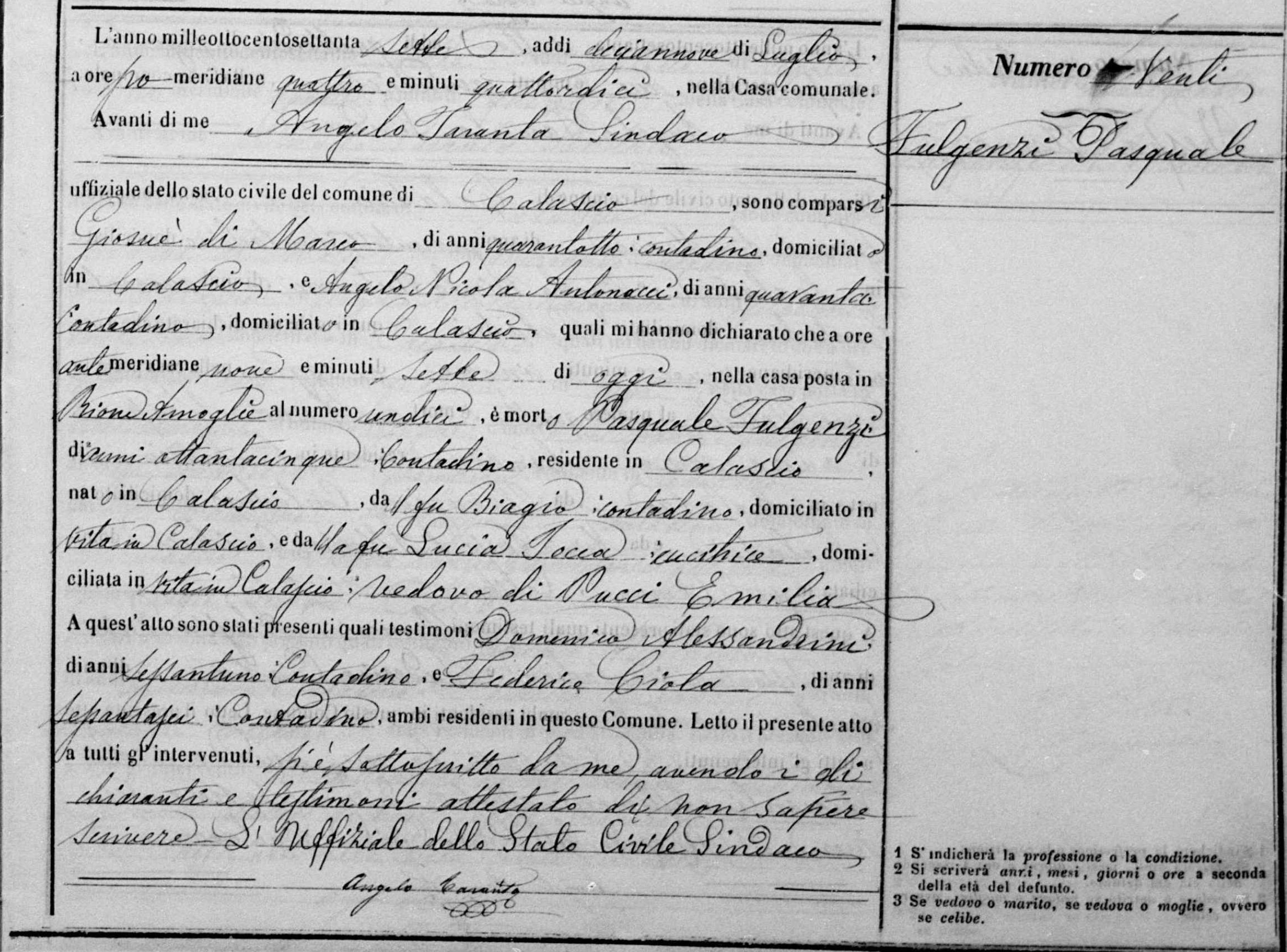 Angela Dea Fulgenzi were married on September 30, 1812 in Calascio, L'Aquila, Abruzzo, Italy. He died.