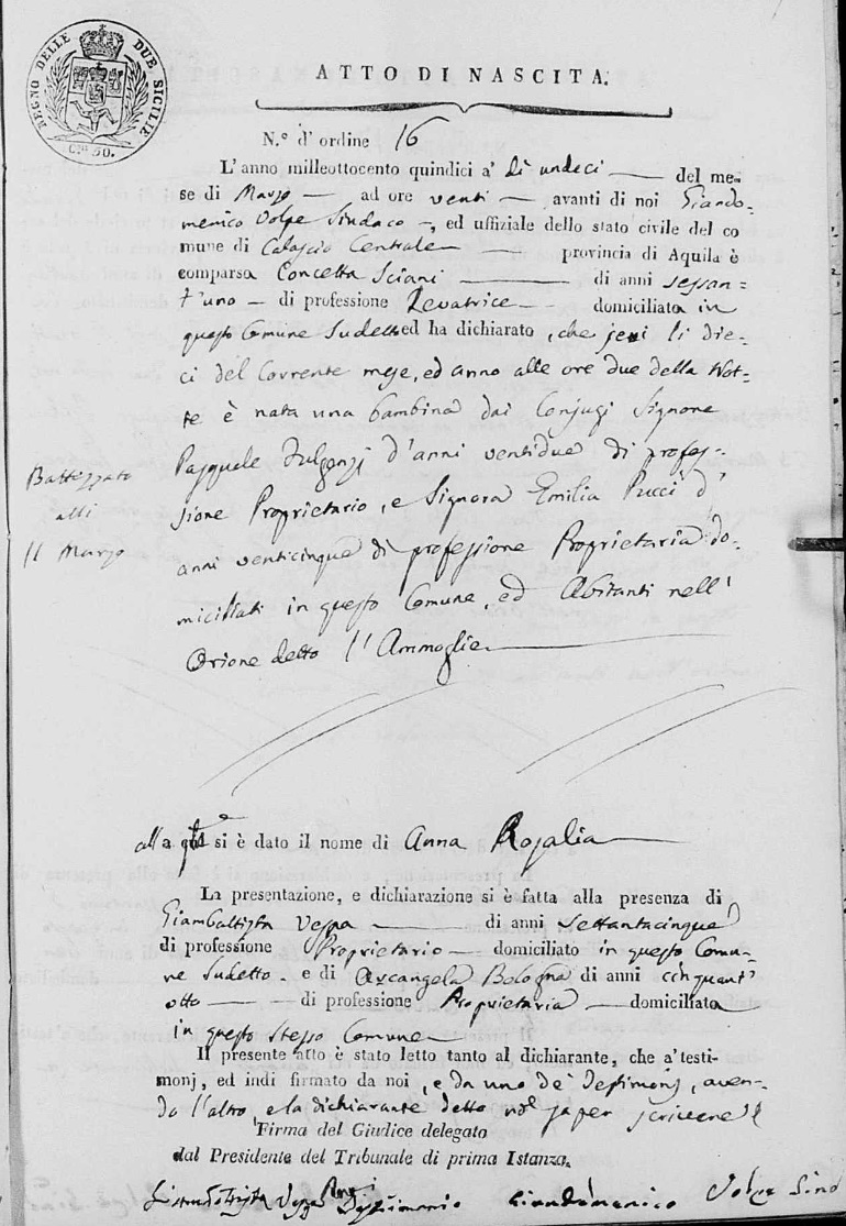 Anna Rosalia Fulgenzi was born on March 10, 1815 in Calascio, L'Aquila, Abruzzo, Italy. She and