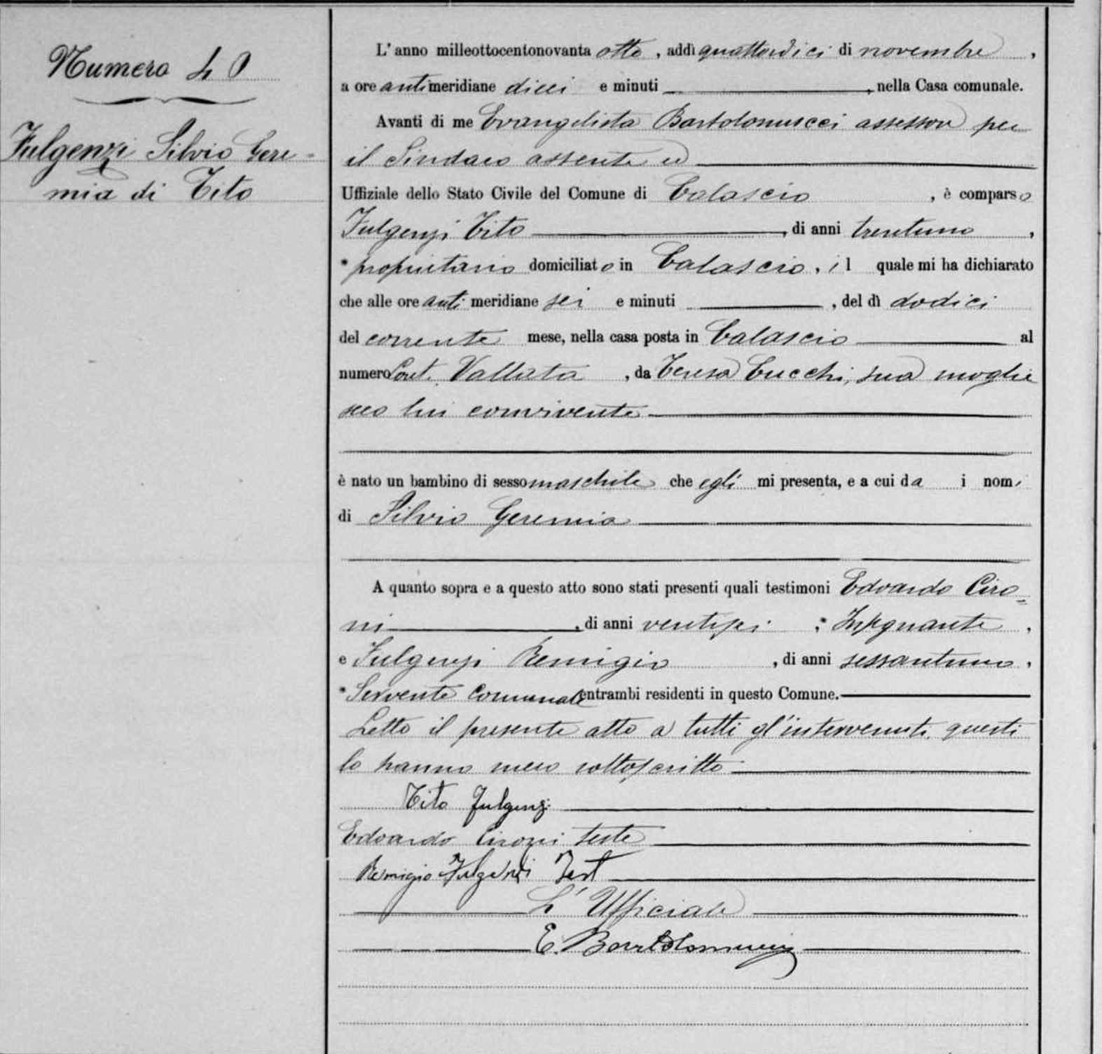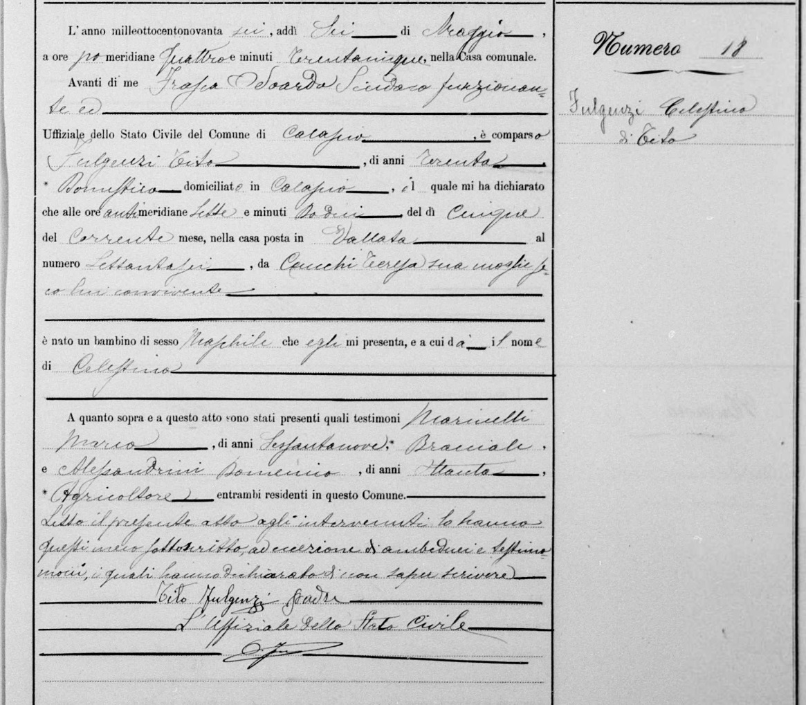 Luigi Fulgenzi was born on December 14, 1862 in Calascio, L'Aquila, Abruzzo, Italy. He died on December 29, 1862, at age 0, in Calascio, L'Aquila, Abruzzo, Italy.