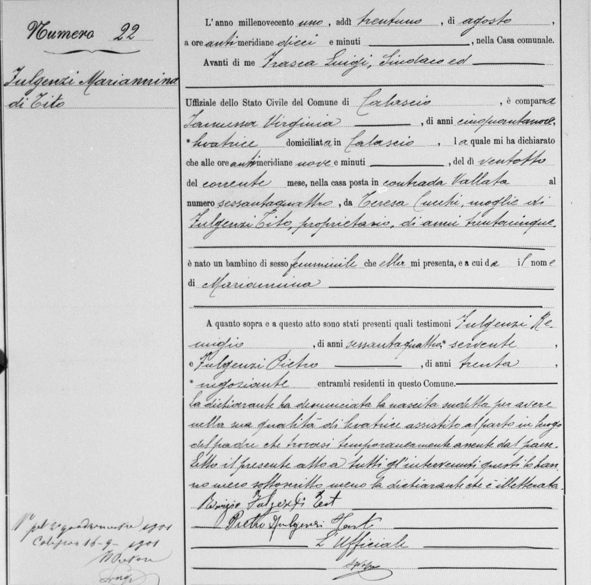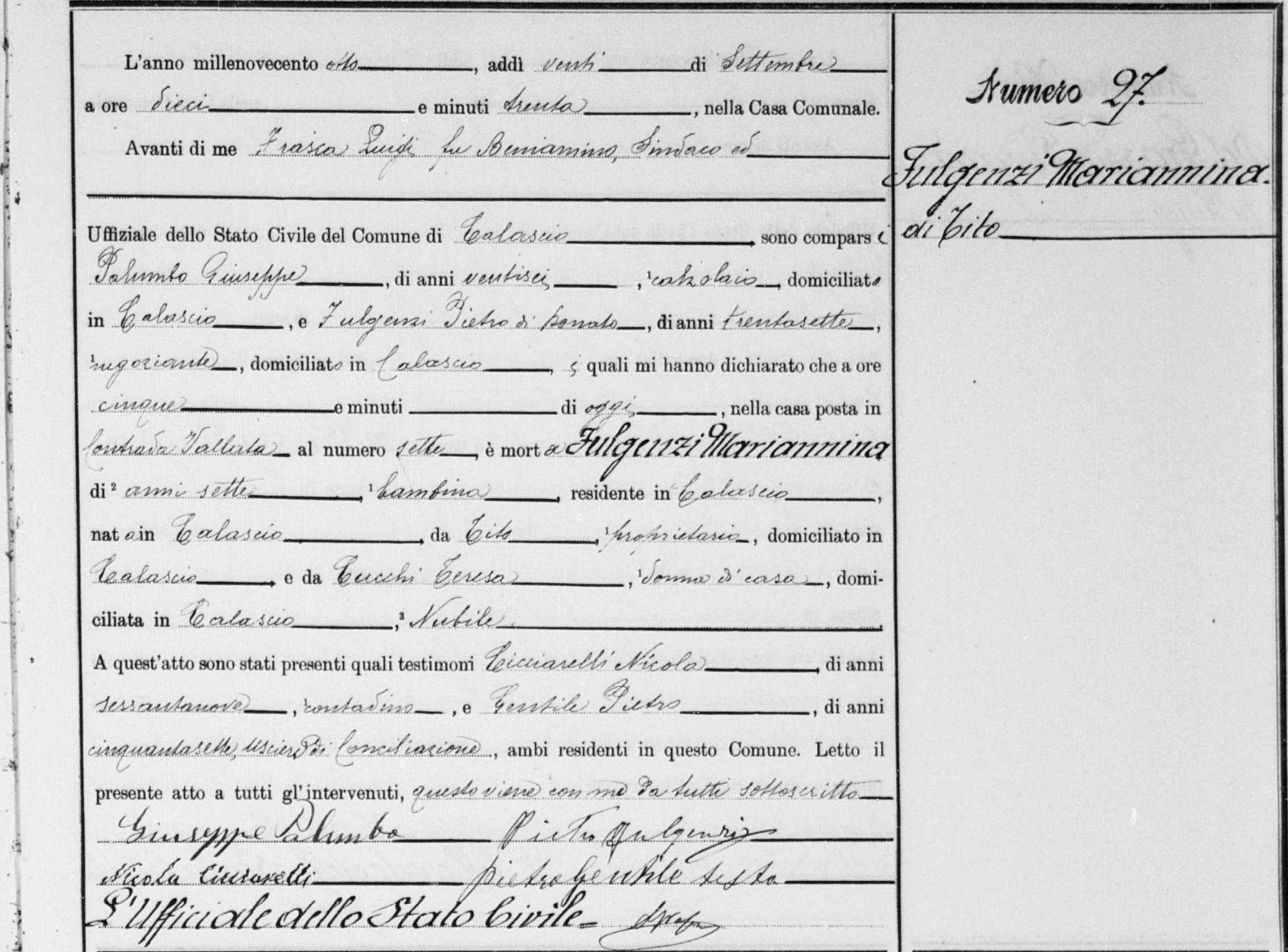 Mariannina Fulgenzi was born on August 28, 1901 in Calascio, L'Aquila, Abruzzo, Italy. She died on September 20, 1908, at age 7, in Calascio, L'Aquila, Abruzzo, Italy.