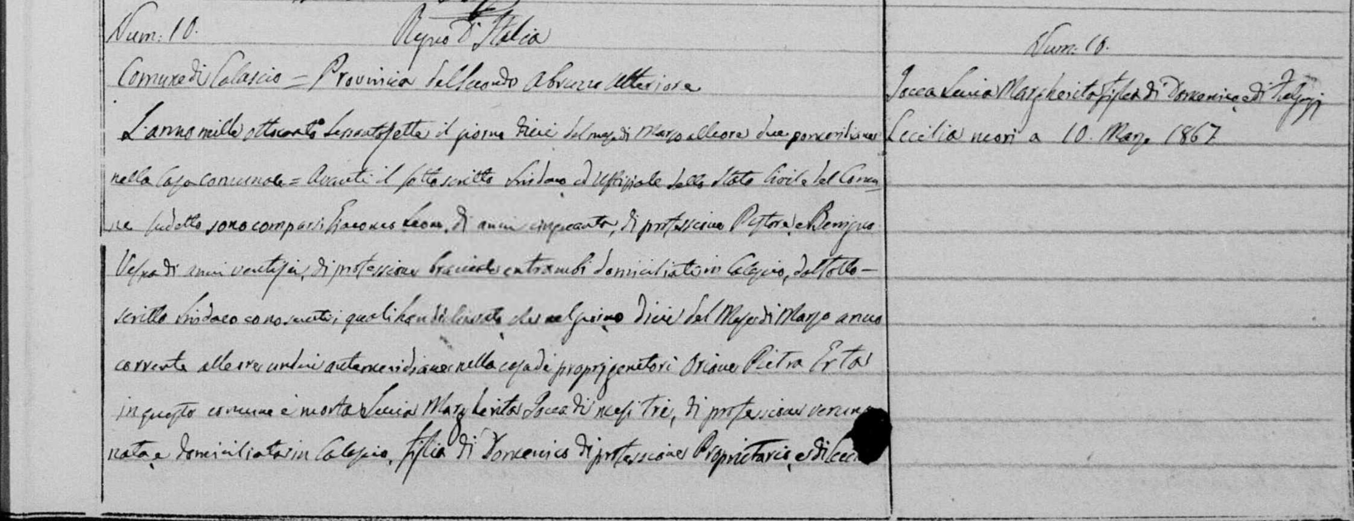 Margherita Lucia Iocca was born on December 13, 1866 in Calascio, L'Aquila, Abruzzo, Italy. She died on March 10, 1867, at age 0, in Calascio, L'Aquila, Abruzzo, Italy.