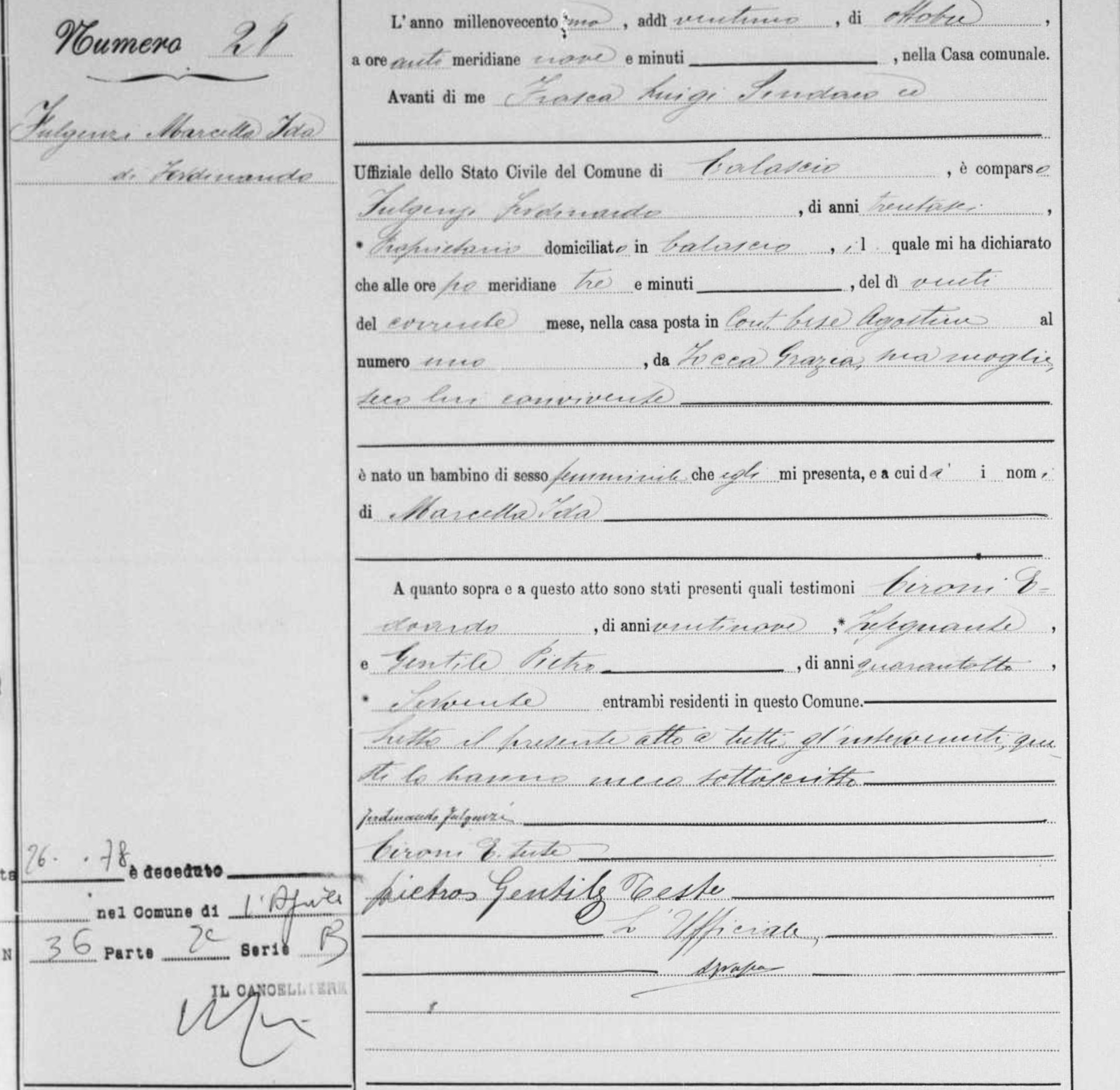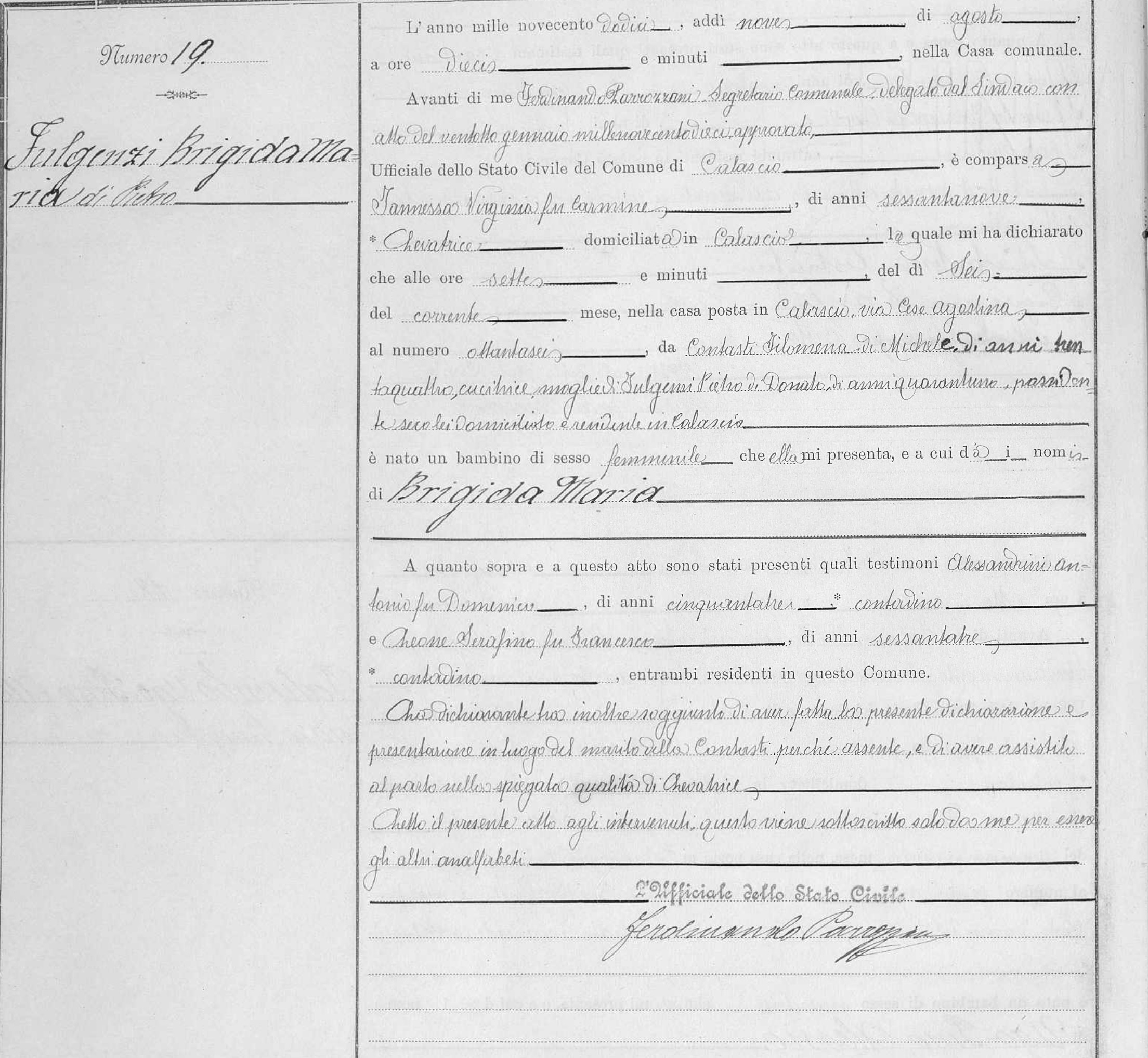 Marcella Ida Fulgenzi was born on October 20, 1901 in Calascio, L'Aquila, Abruzzo, Italy. She and