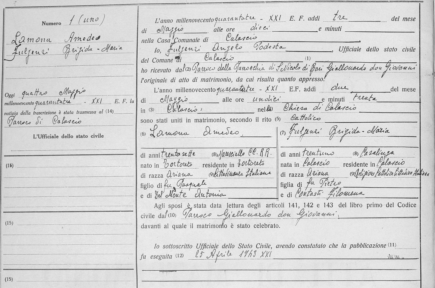 Amedeo Lamona were married on May 3, 1943 in Calascio, L'Aquila, Abruzzo, Italy. She died.