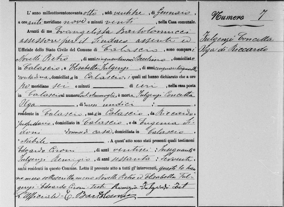 Domenico Fulgenzi were married on July 2, 1886 in Calascio, L'Aquila, Abruzzo, Italy. She died.