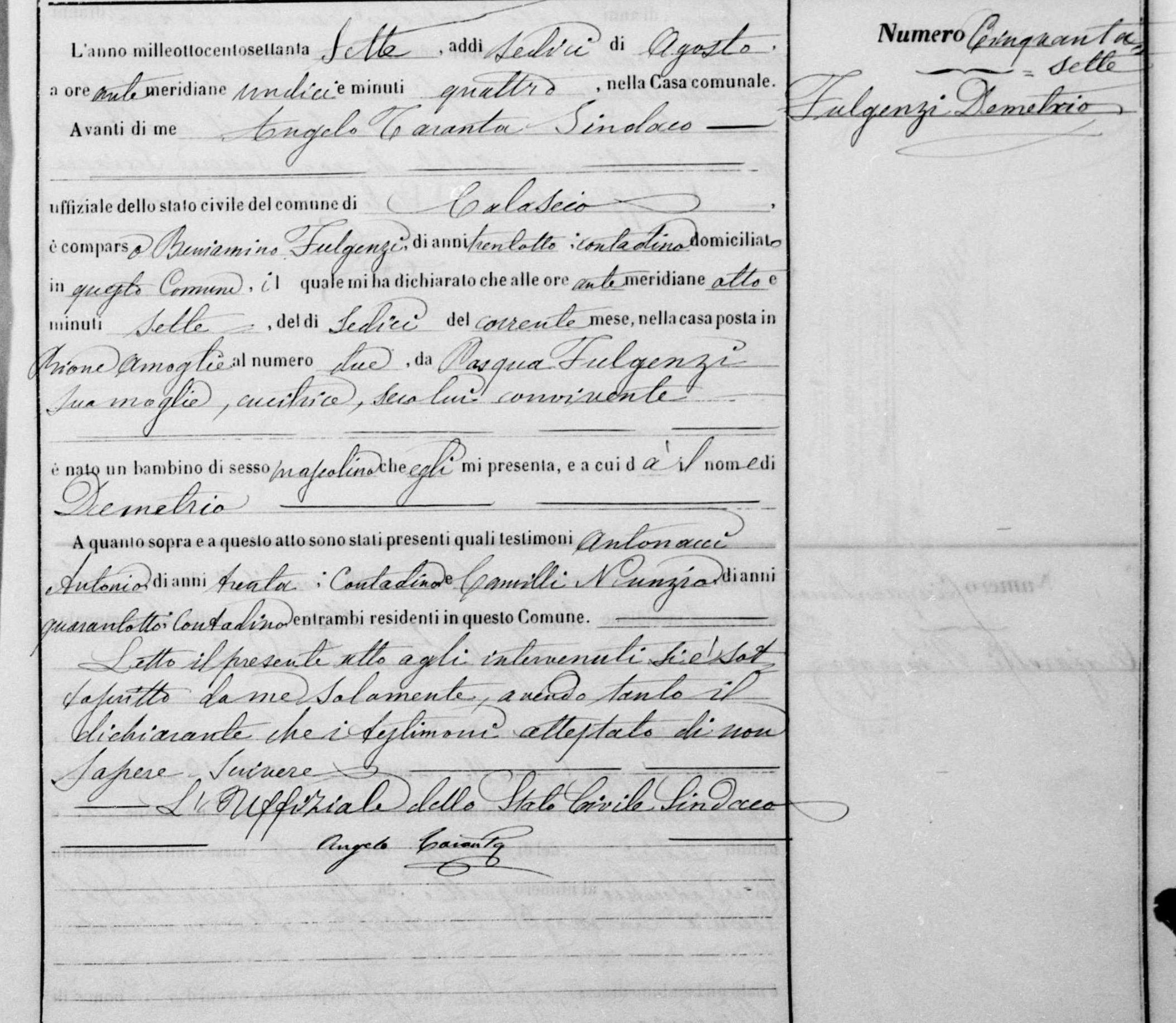 Demetrio Fulgenzi was born on August 16, 1877 in Calascio, L'Aquila, Abruzzo, Italy. He died on April 17, 1880, at age 2, in Calascio, L'Aquila, Abruzzo, Italy.