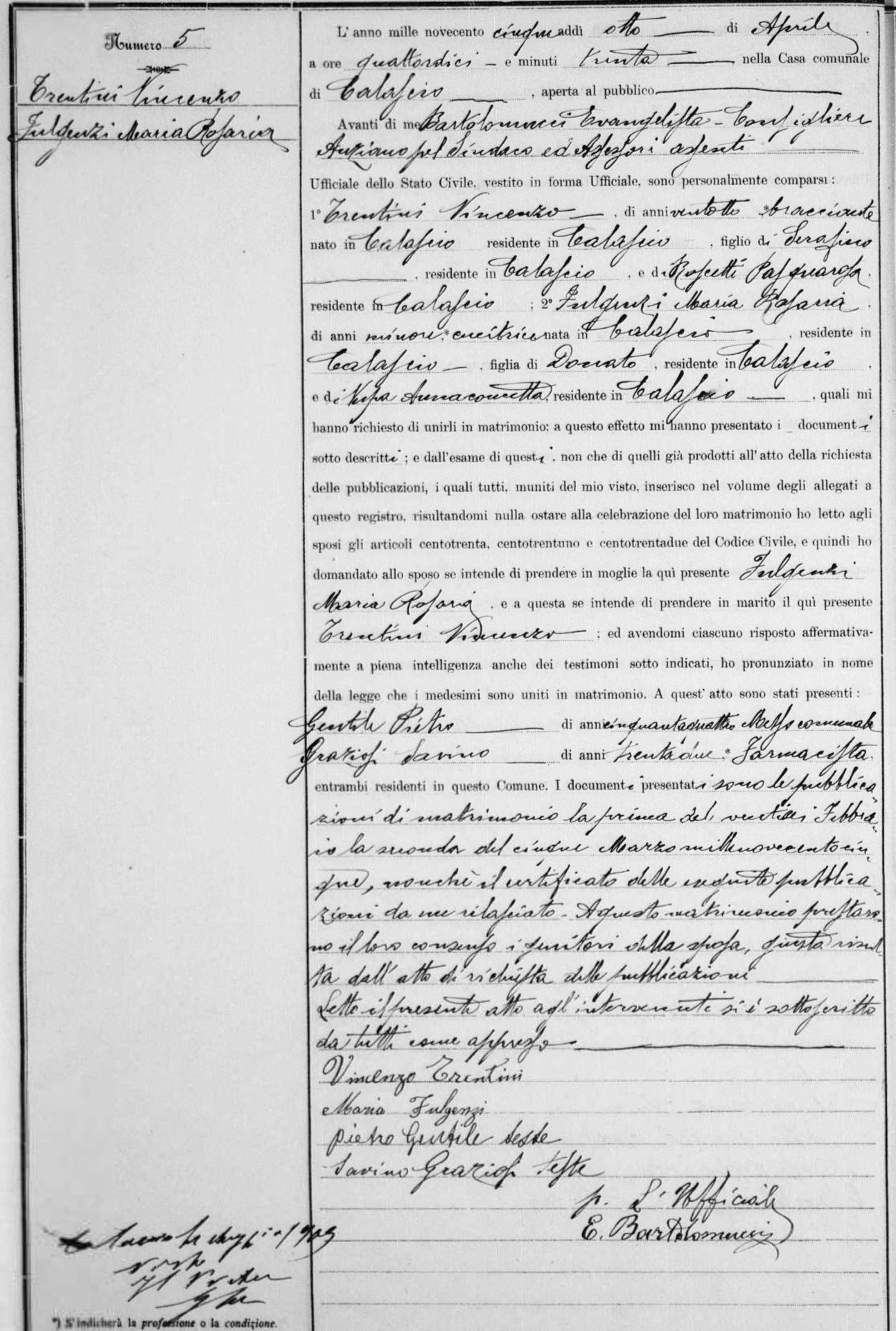 Vincenzo Trentini were married on April 8, 1905 in Calascio, L'Aquila, Abruzzo, Italy. She and