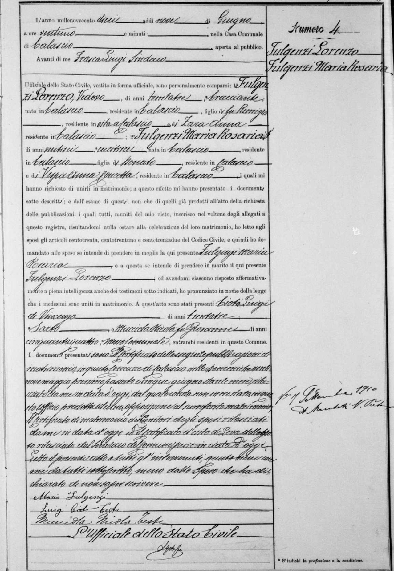 Lorenzo Fulgenzi were married on June 9, 1910 in Calascio, L'Aquila, Abruzzo, Italy. She died.