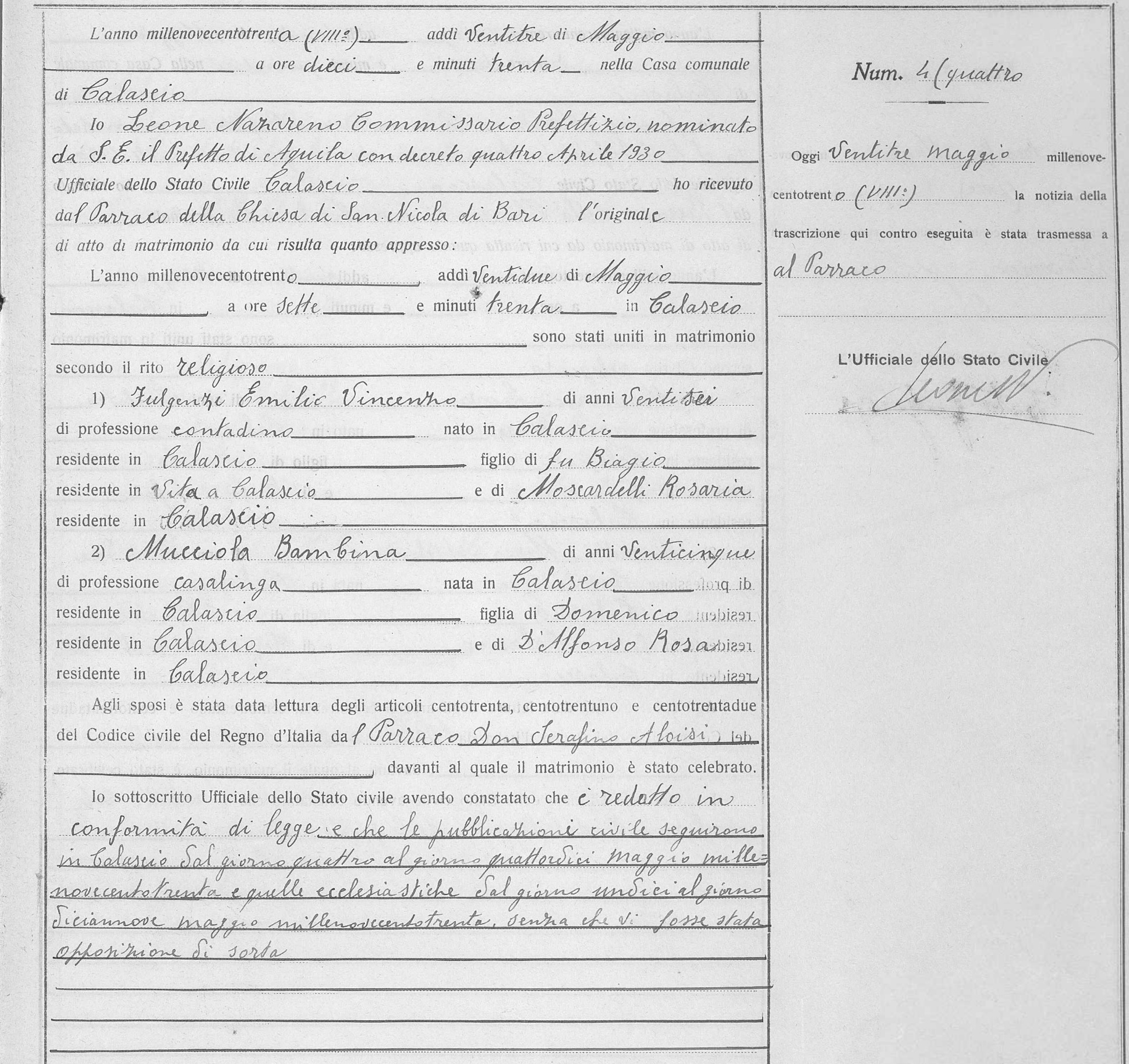 Emilio Vincenzo Fulgenzi were married on May 23, 1930 in Calascio, L'Aquila, Abruzzo, Italy. She died.