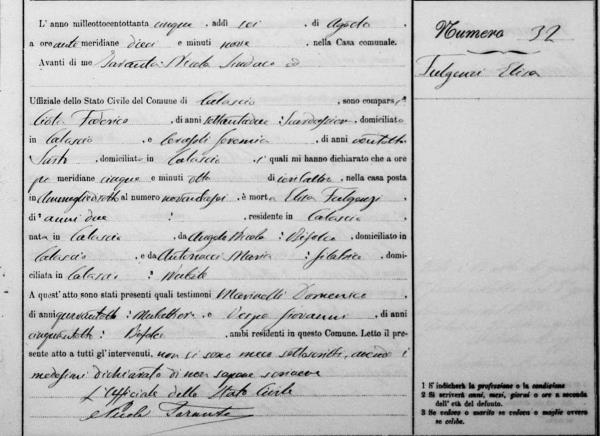 Elisa Fulgenzi was born on July 22, 1883 in Calascio, L'Aquila, Abruzzo, Italy. She died on August 6, 1885, at age 2, in Calascio, L'Aquila, Abruzzo, Italy.