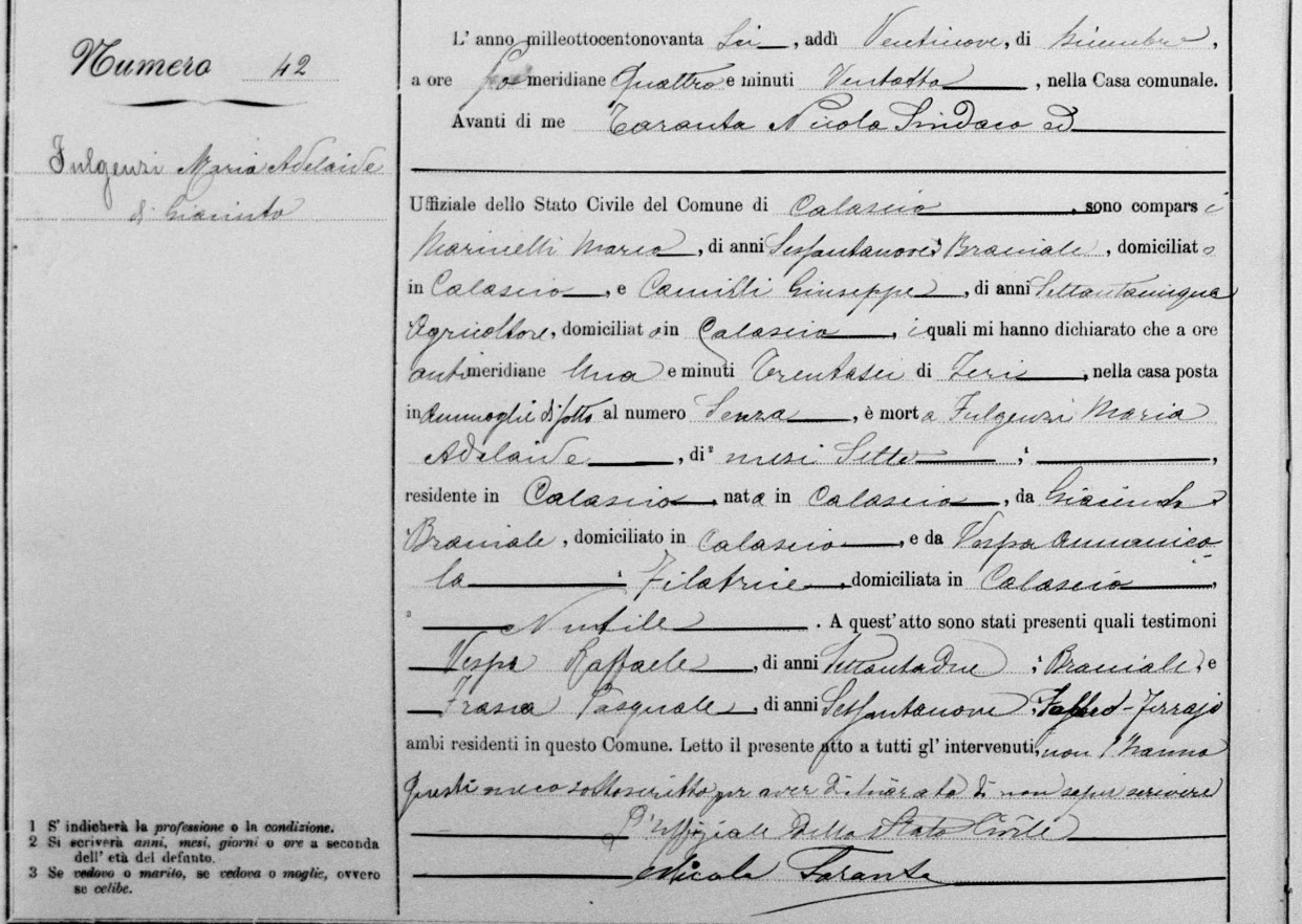Maria Adelaide Fulgenzi was born on May 3, 1896 in Calascio, L'Aquila, Abruzzo, Italy. She died on December 29, 1896, at age 0, in Calascio, L'Aquila, Abruzzo, Italy.