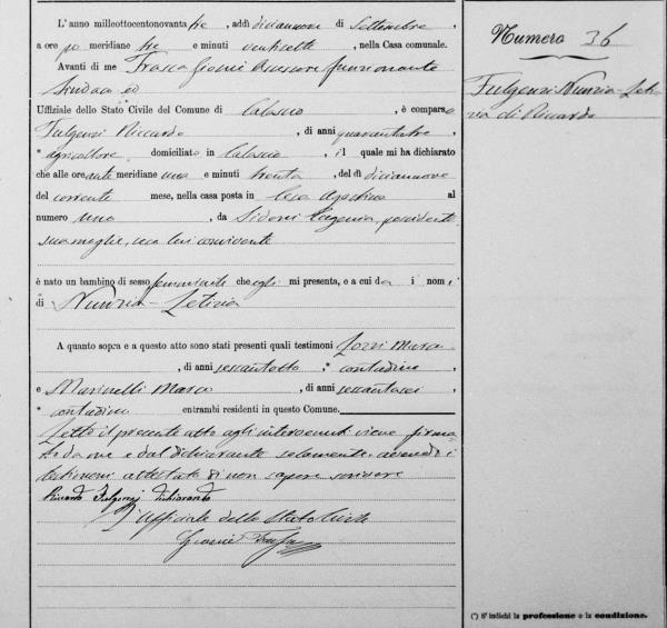 Nunzia Letizia Fulgenzi was born on September 19, 1893 in Calascio, L'Aquila, Abruzzo, Italy. She died on September 18, 1918, at age 24, in Calascio, L'Aquila, Abruzzo, Italy.