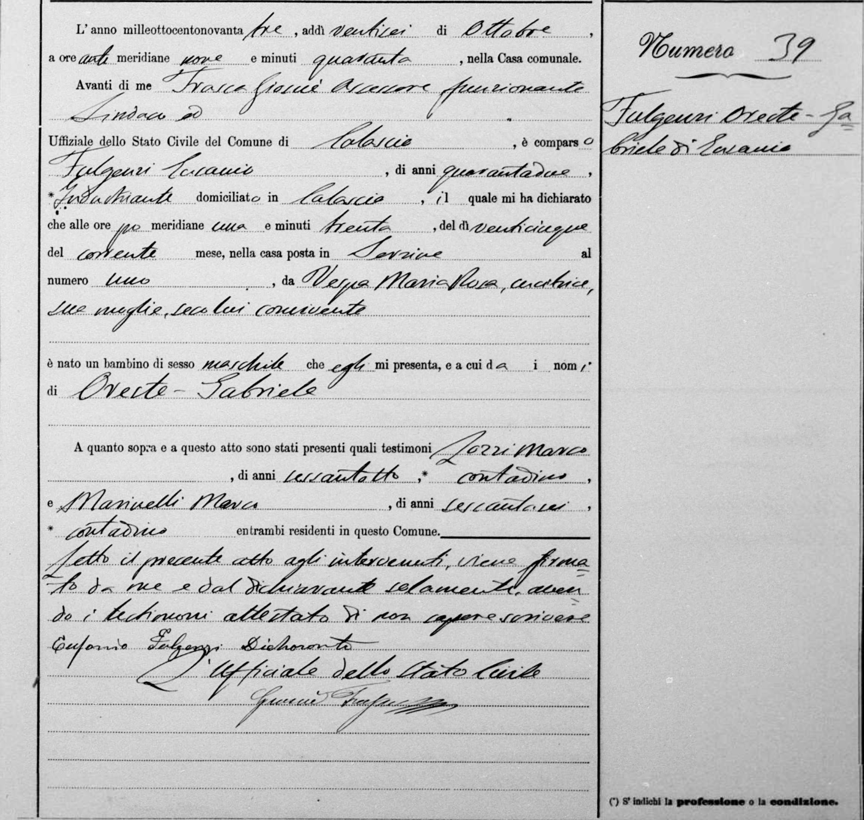 Orete Gabriele Fulgenzi was born on October 25, 1893 in Calascio, L'Aquila, Abruzzo, Italy. He died on February 15, 1894, at age 0, in Calascio, L'Aquila, Abruzzo, Italy.