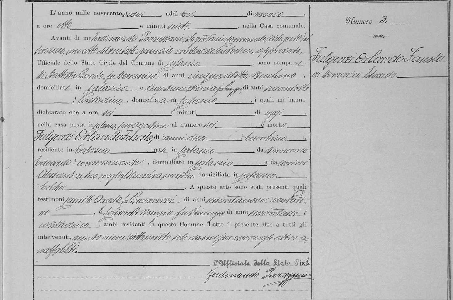 Orlando Fausto Fulgenzi was born on March 12, 1906 in Calascio, L'Aquila, Abruzzo, Italy. He died on March 3, 1916, at age 9, in Calascio, L'Aquila, Abruzzo, Italy.
