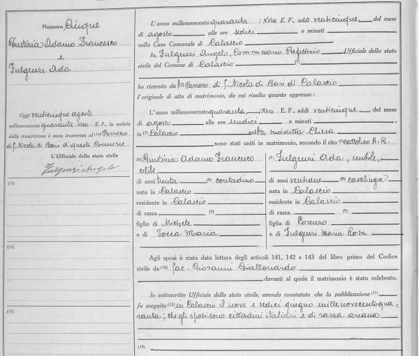Ada Fulgenzi were married on August 25, 1940 in Bari, Bari, Puglia, Italy. He died.