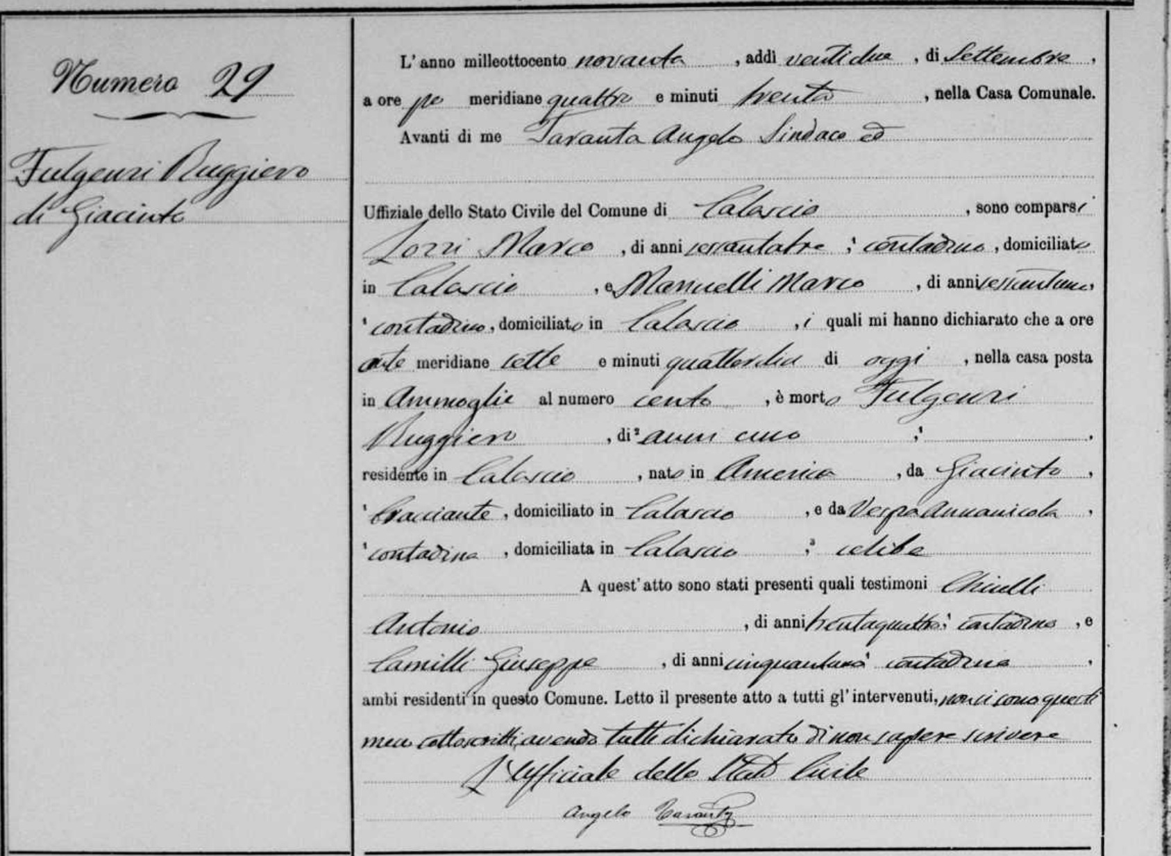 Ruggerio Filadolfo Fulgenzi was born on May 29, 1894 in Calascio, L'Aquila, Abruzzo, Italy. He died on May 3, 1895, at age 0, in Calascio, L'Aquila, Abruzzo, Italy.