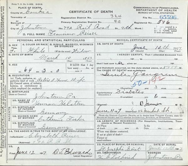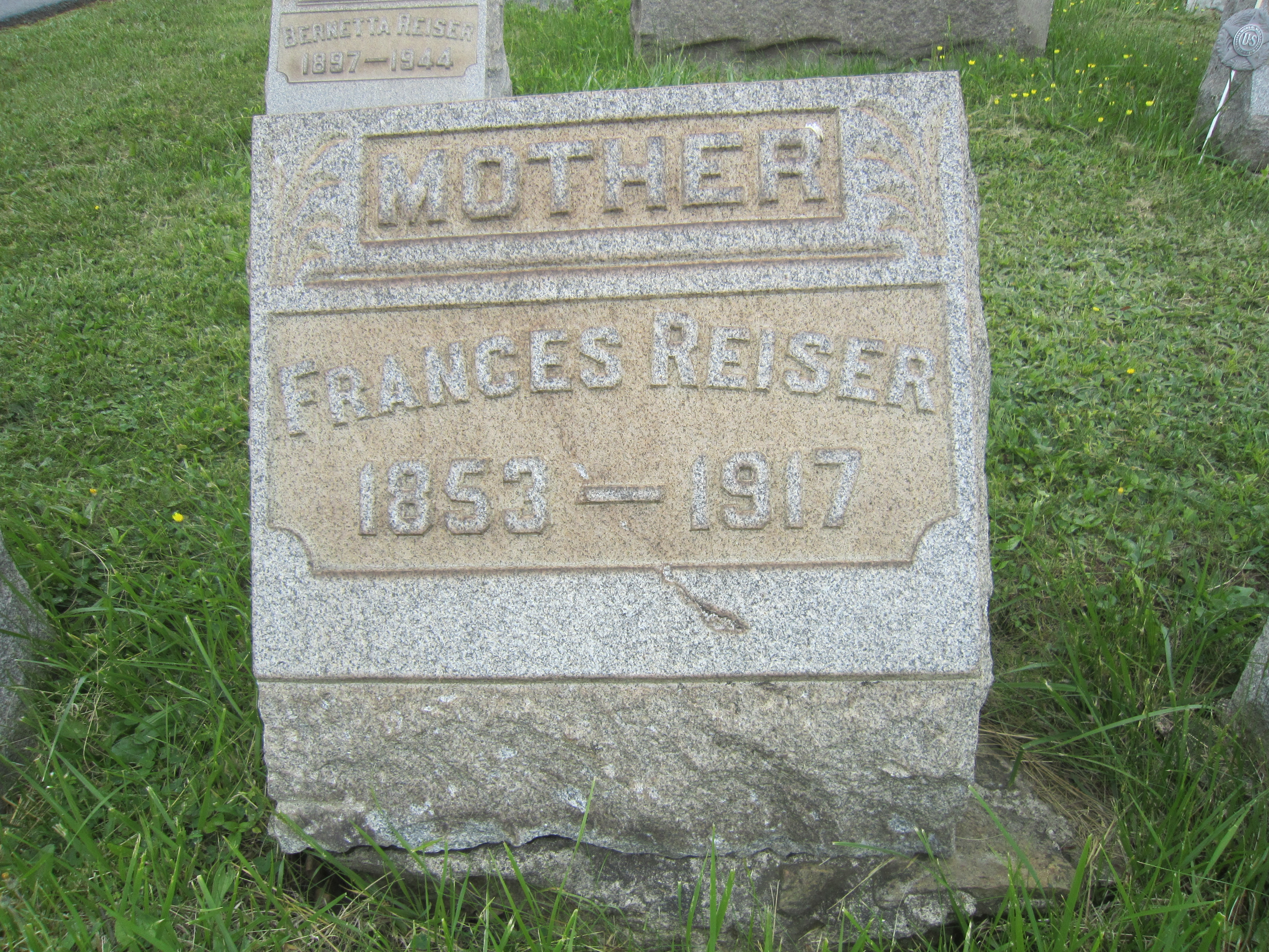 Joseph Reiser were married. She died on June 10, 1917, at age 64, in Johnstown, Cambria, Pennsylvania, USA. She was buried in Saint Joseph Cemetery, Geistown, Pennsylvania.