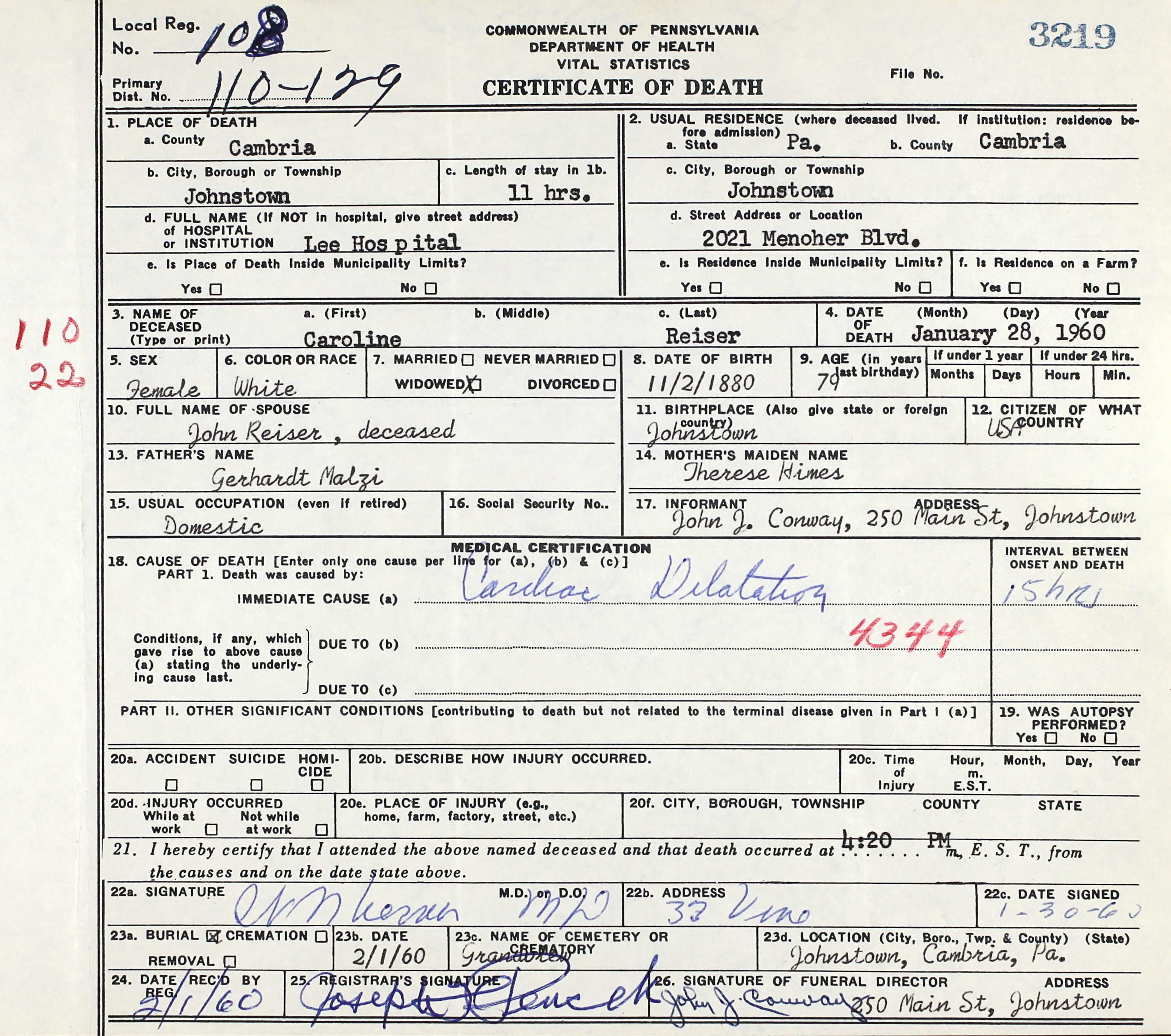 John Reiser were married in 1900. She died on January 28, 1960, at age 79, in Johnstown, Cambria, Pennsylvania, USA. She was buried in Grandview Cemetery, Johnstown, Pennsylvania.