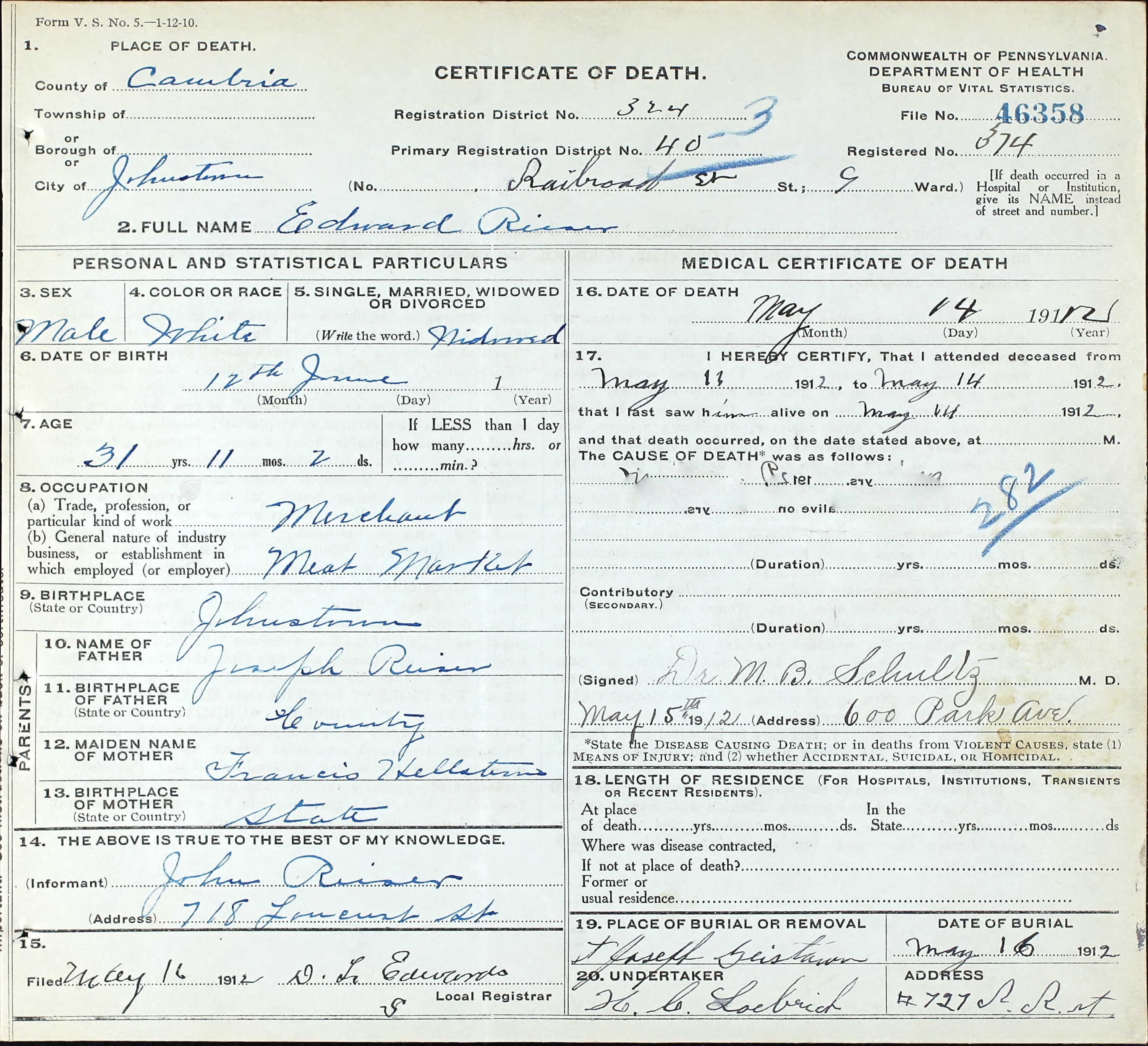 Rose Snyder were married. He died on May 14, 1912, at age ~32, in Johnstown, Cambria, Pennsylvania, USA. He was buried in Saint Joseph Cemetery, Geistown, Pennsylvania.