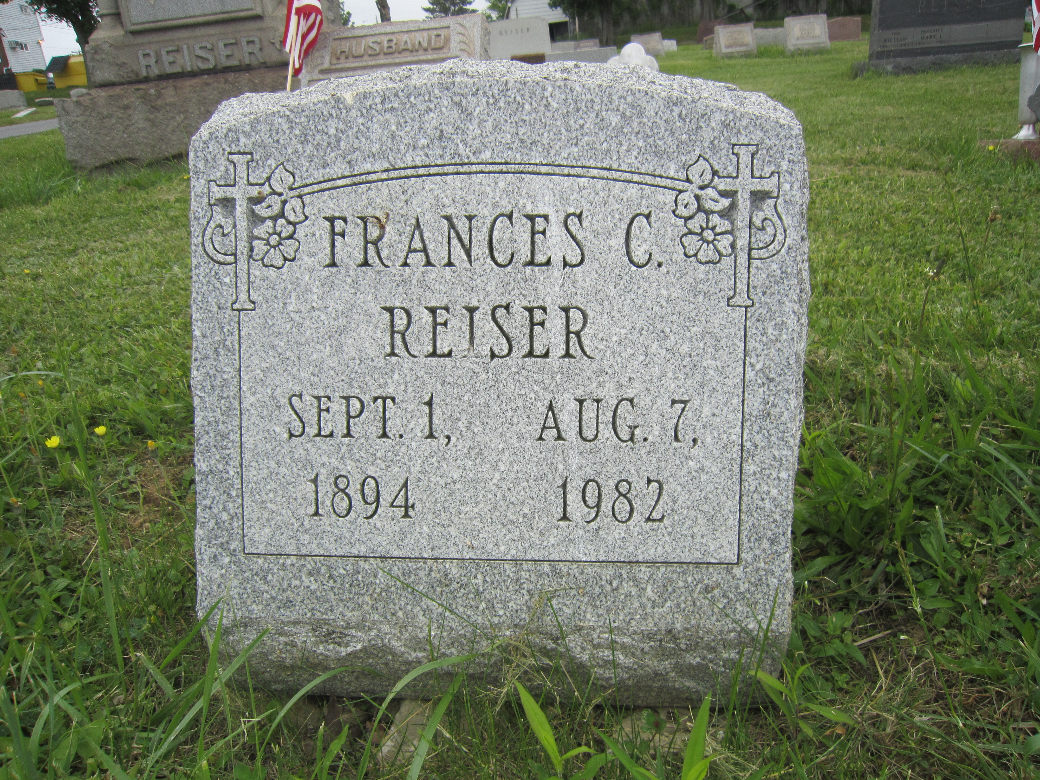 Frances C. Reiser was born on September 1, 1894 in Johnstown, Cambria, Pennsylvania, USA. She died on August 7, 1982, at age 87, in Johnstown, Cambria, Pennsylvania, USA. She was buried in Saint Joseph Cemetery, Geistown, Pennsylvania.