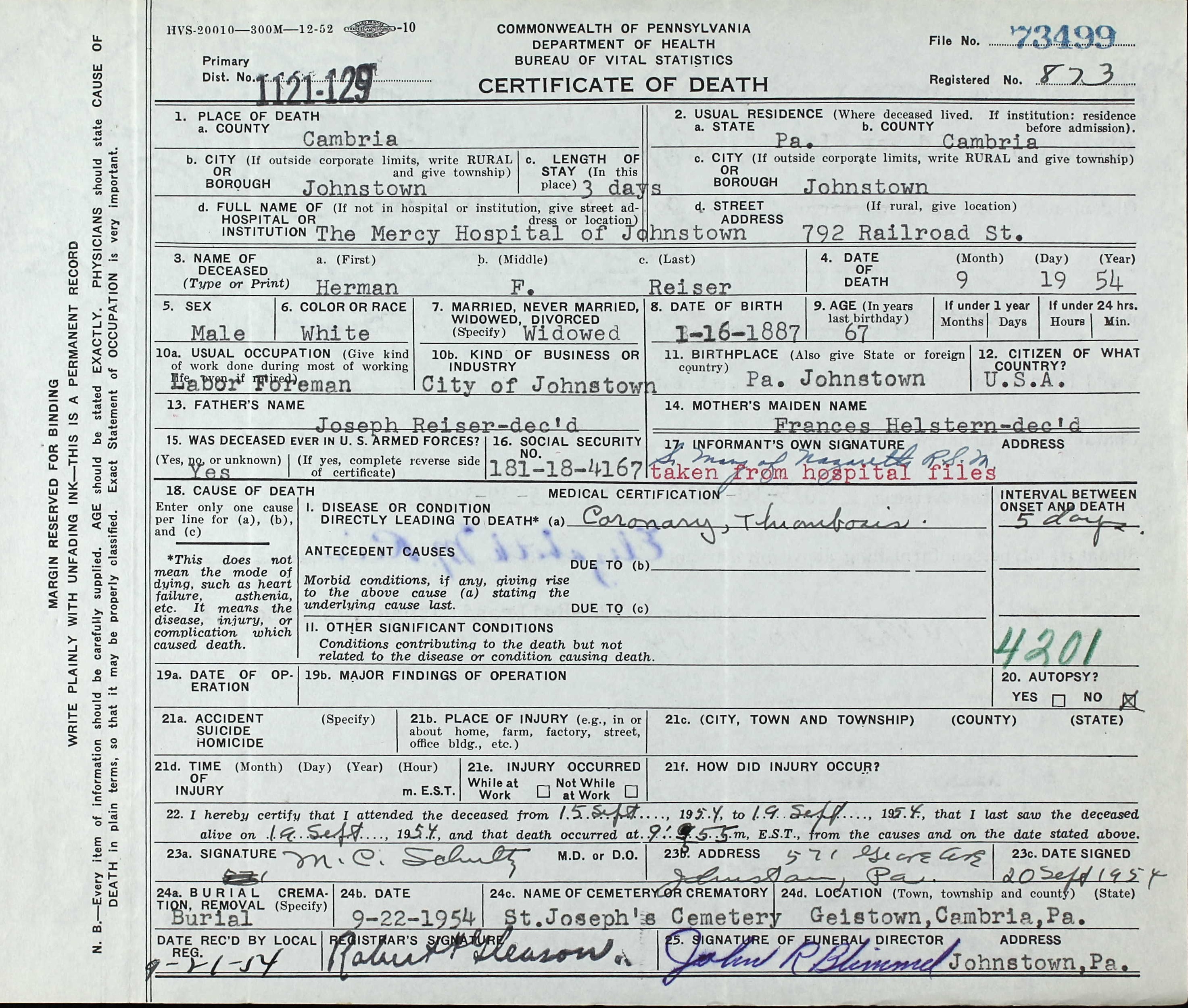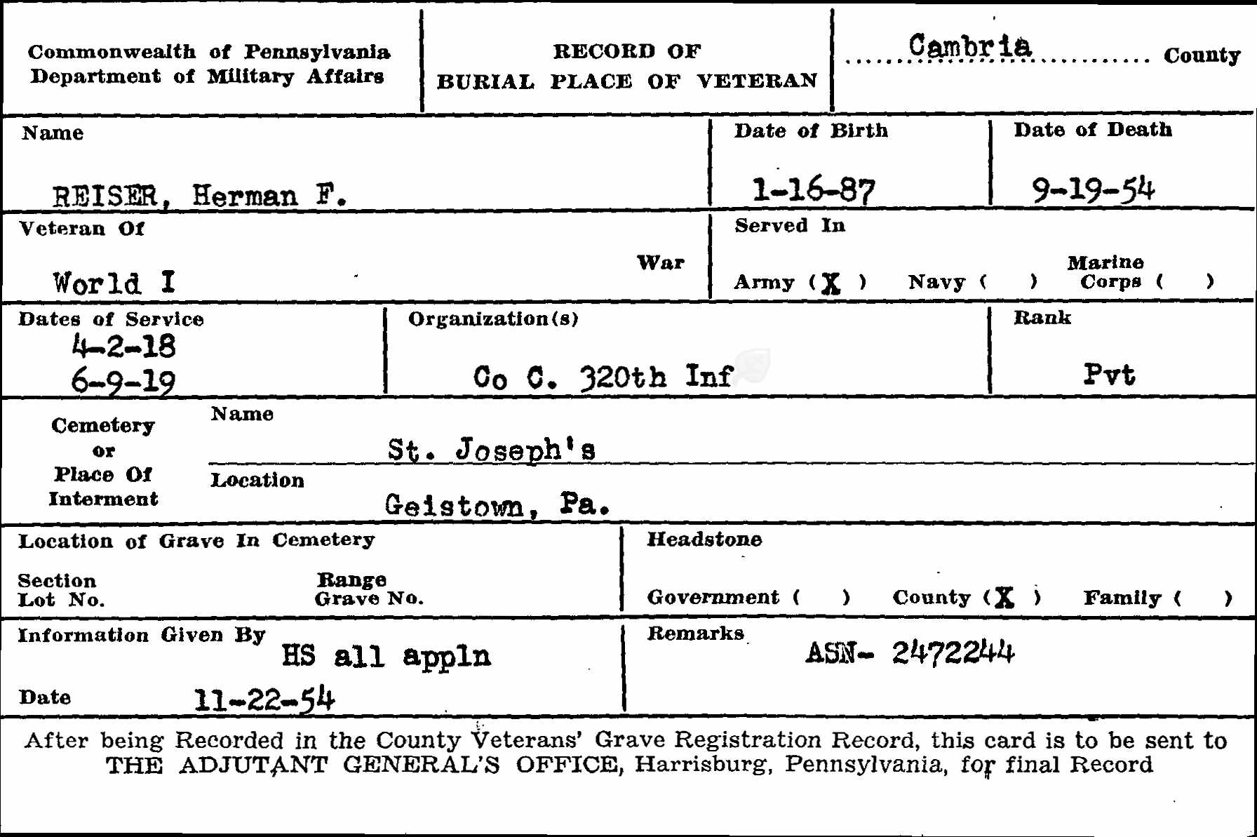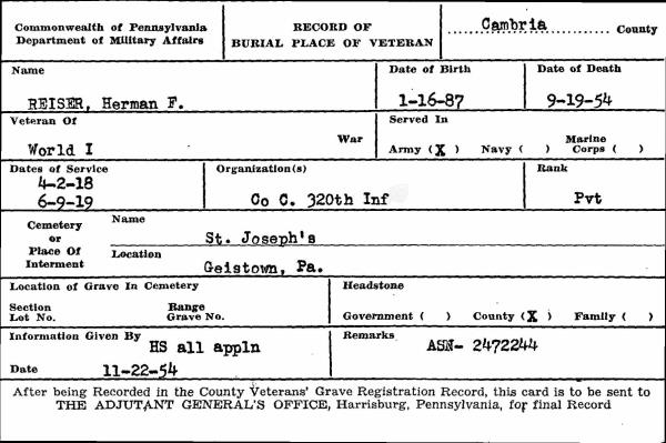 Herman F. Reiser was born on January 16, 1887 in Johnstown, Cambria, Pennsylvania, USA. He and